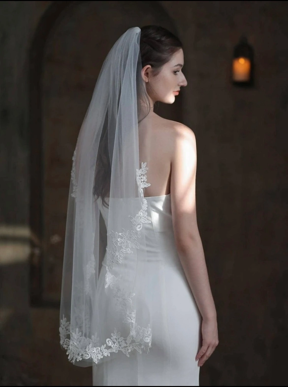 This veil is single layer, white, and has a comb to secure it to your hair. It is made of soft tulle and has delicate lace trim around the edge. The lace is intricate and has a floral design. The veil is 1 tier and is fingertip length.