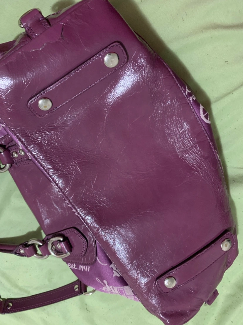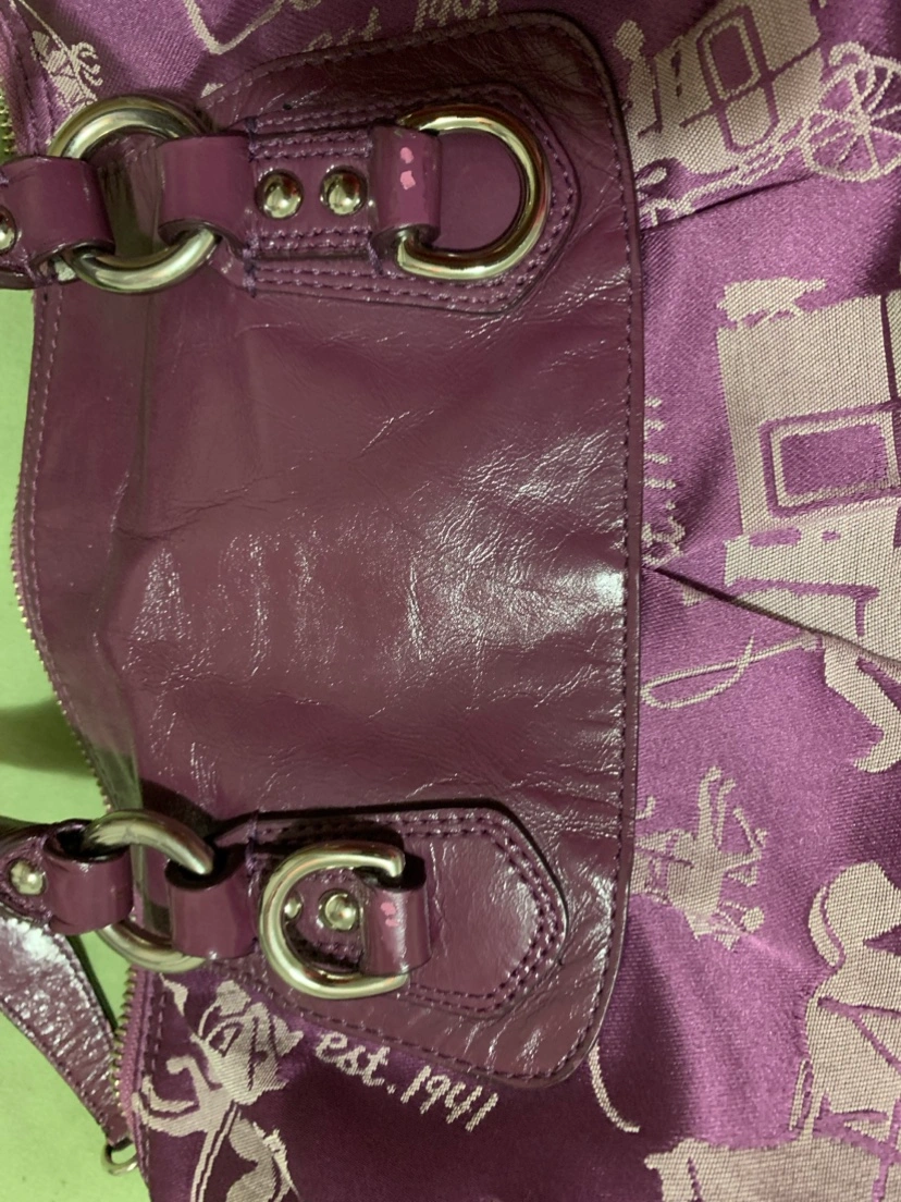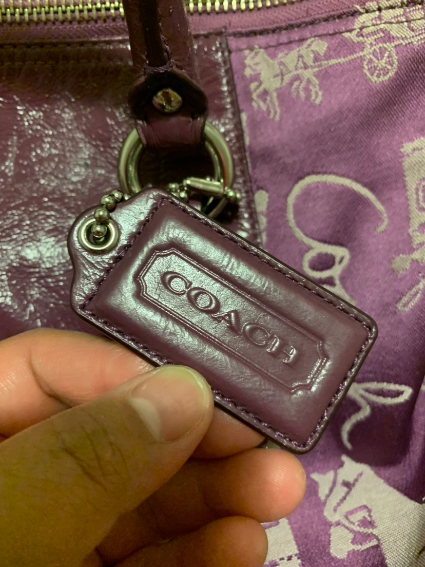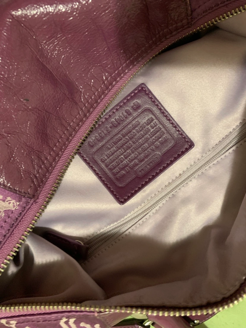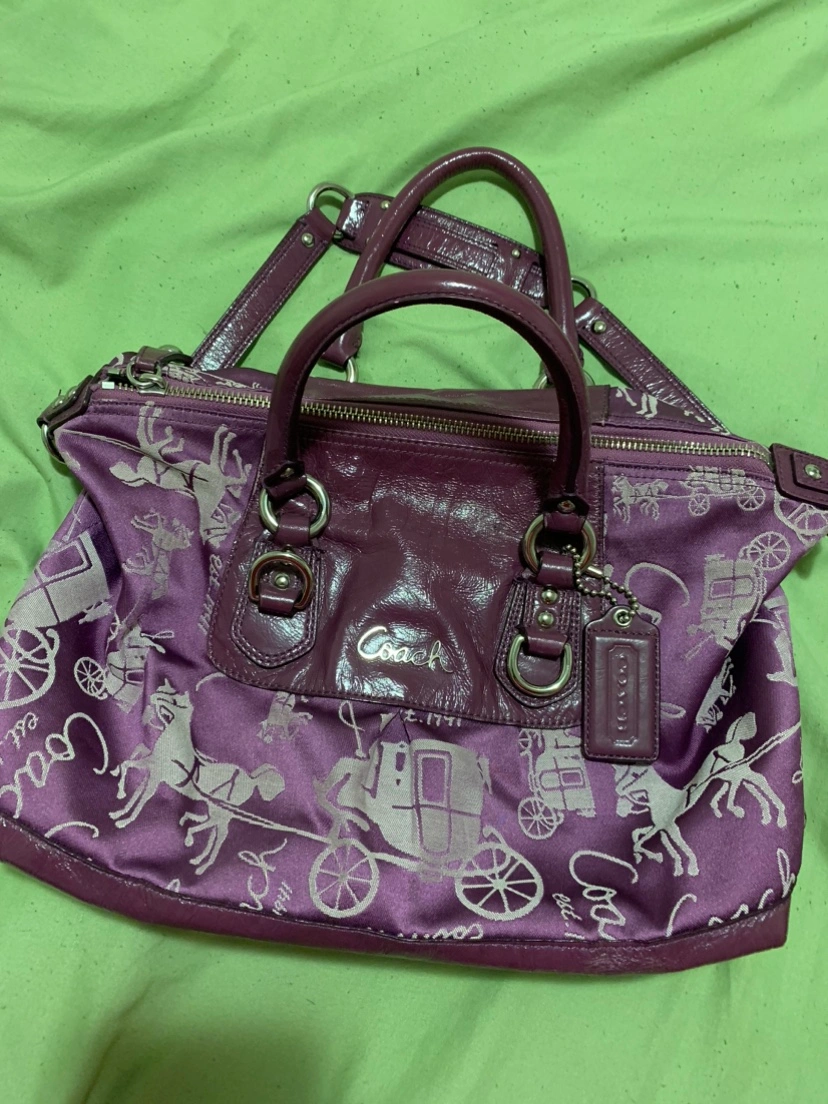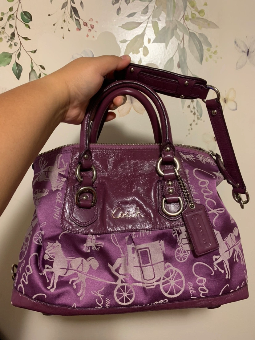 Original purple Coach handbag with a horse and carriage pattern. Includes an additional strap for shoulder carrying. It features a zipper closure and a large zippered pocket inside the bag. There is a Coach charm attached to the handbag.