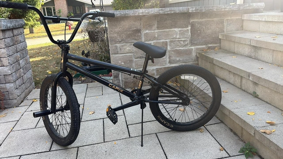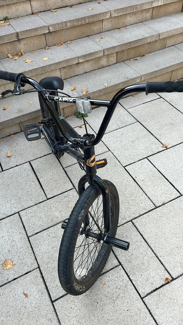 Black BMX bicycle with gold accents. Features include: rear hand brake, pegs on the front wheel, handlebars, pedals, seat, and wheels.
