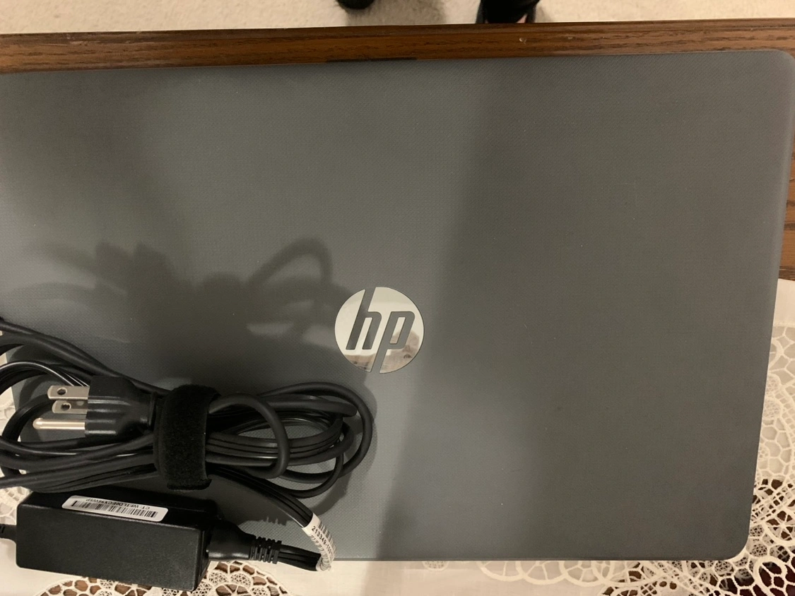 Grey 15” HP laptop with charger. I bought this for my mom but she was given a laptop from work. It has hardly been used at all, in perfect condition. No scratches or marks.