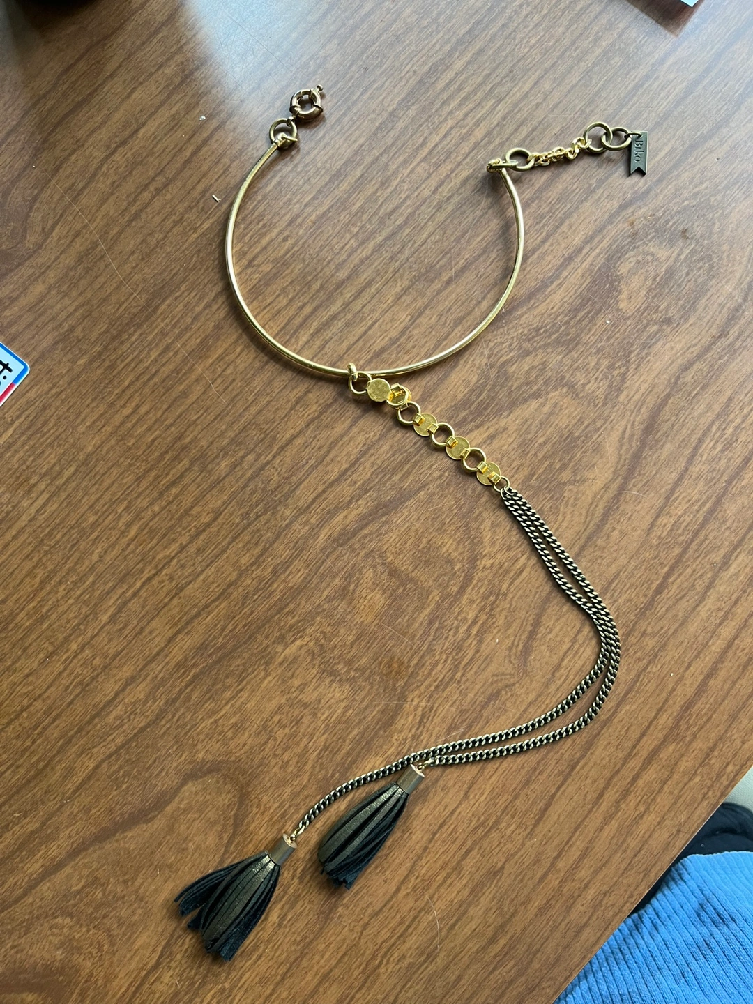 From local Toronto designer BIKO. Gold-plated statement necklace featuring a collar style neckline, a decorative chain with gold coloured accents, and two black leather/golden tassels.