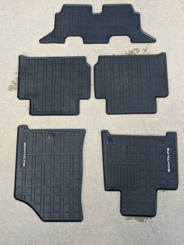 Set of five black rubber floor mats for a Hyundai 2024 Santa Fe. Includes two front, two middle, and 1 third row.