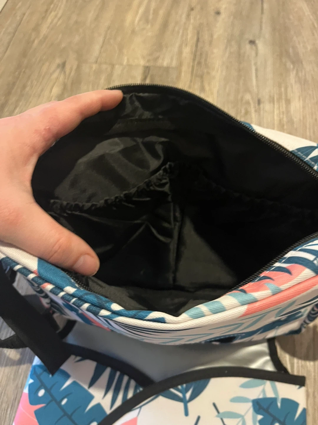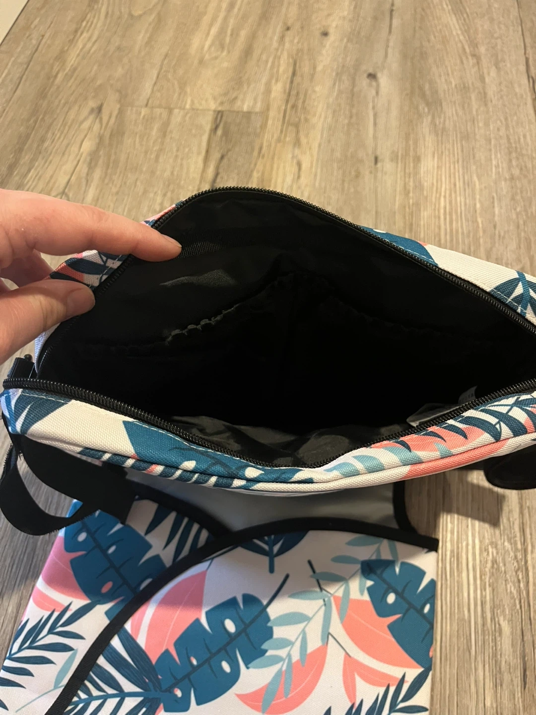 This Momcozy diaper bag comes with a built-in changing pad. It features a tropical leaf print and a black strap with buckle closure. Multiple interior pockets are included for organization.