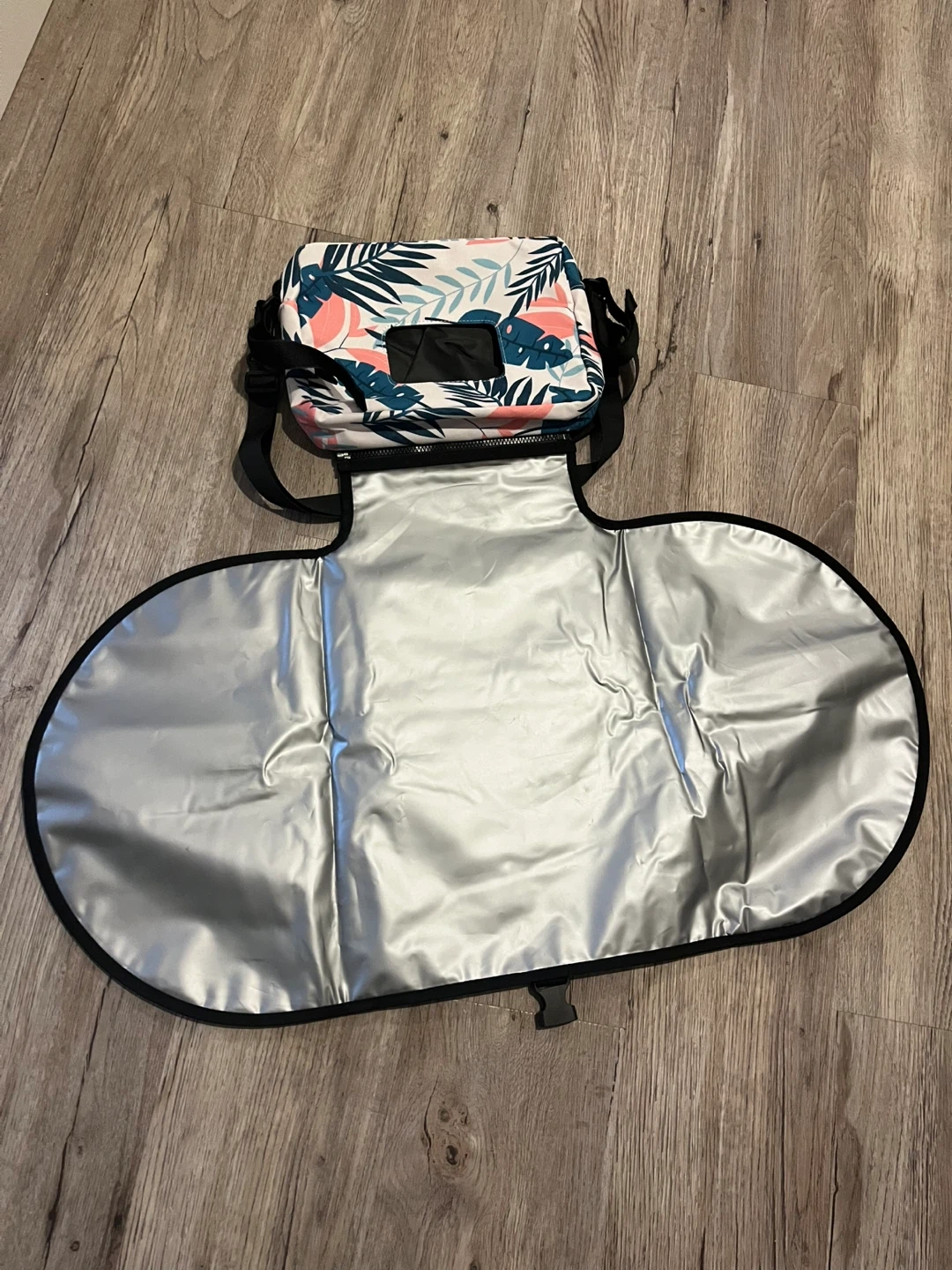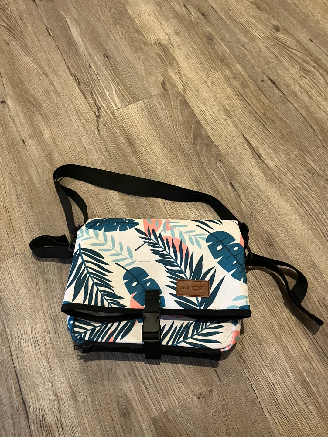 This Momcozy diaper bag comes with a built-in changing pad. It features a tropical leaf print and a black strap with buckle closure. Multiple interior pockets are included for organization.