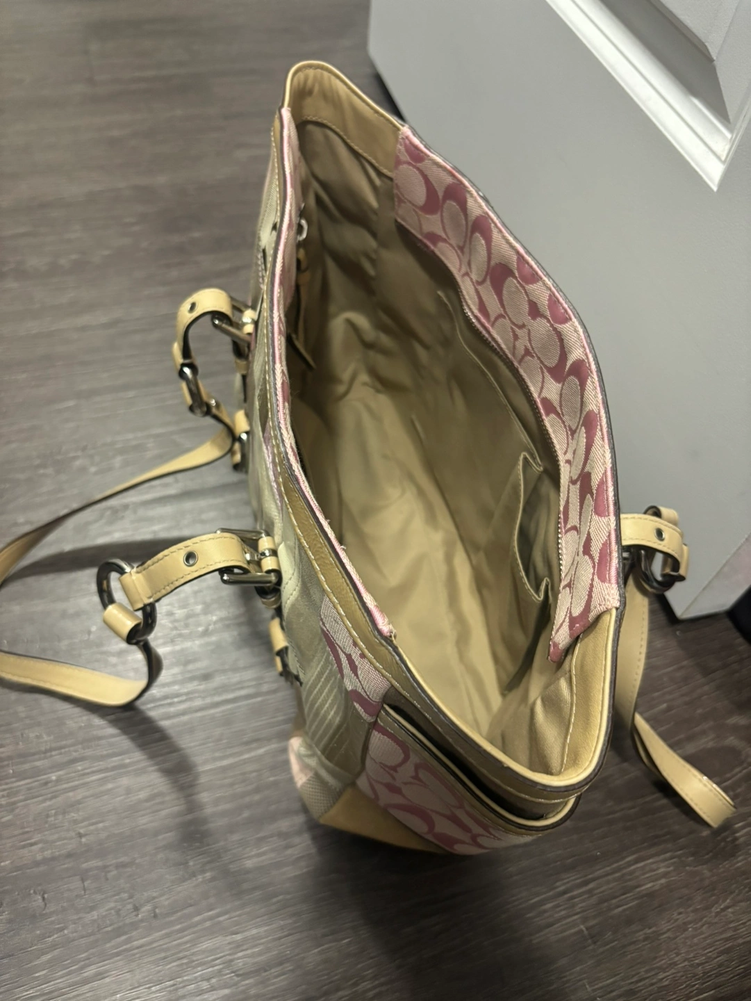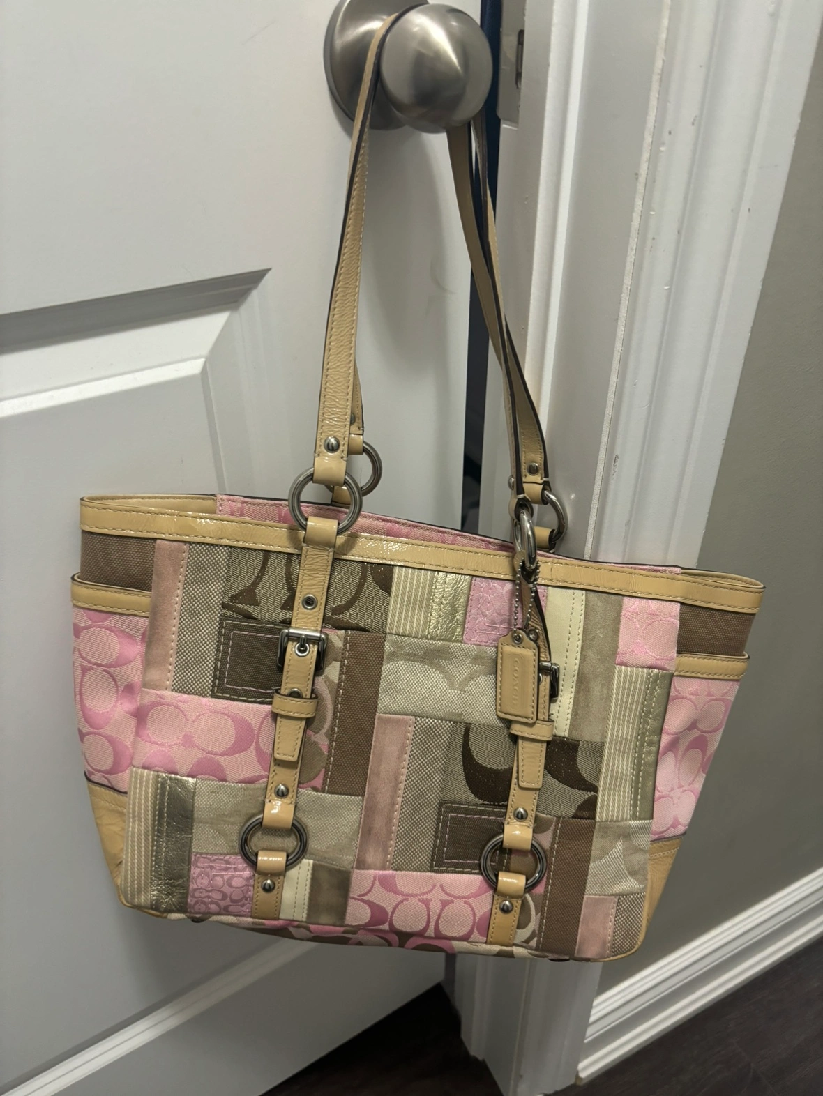 Beautiful Coach tote bag featuring a patchwork design in shades of pink, beige, and brown. The bag has two top handles and a spacious interior. It's perfect for everyday use or carrying your essentials.