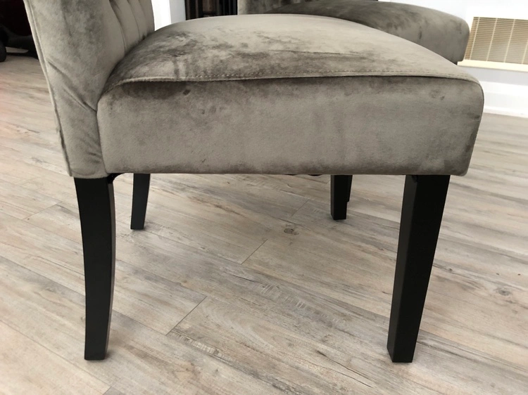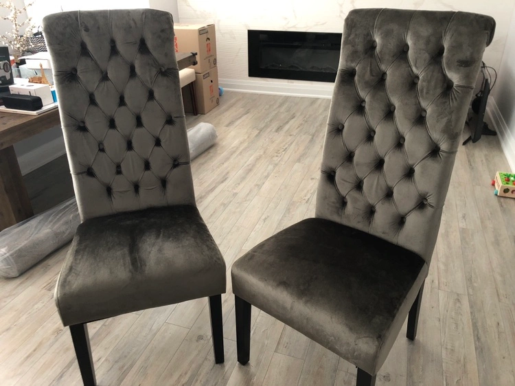 Two elegant dining chairs upholstered in grey velvet with button tufting and black legs. Features a high back and comfortable seat.