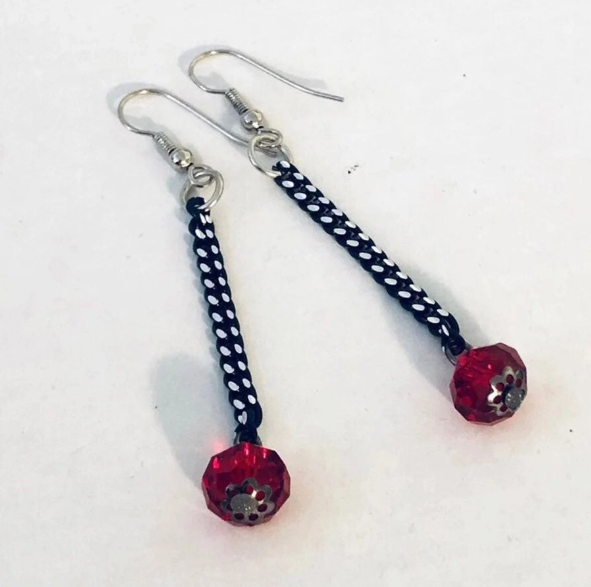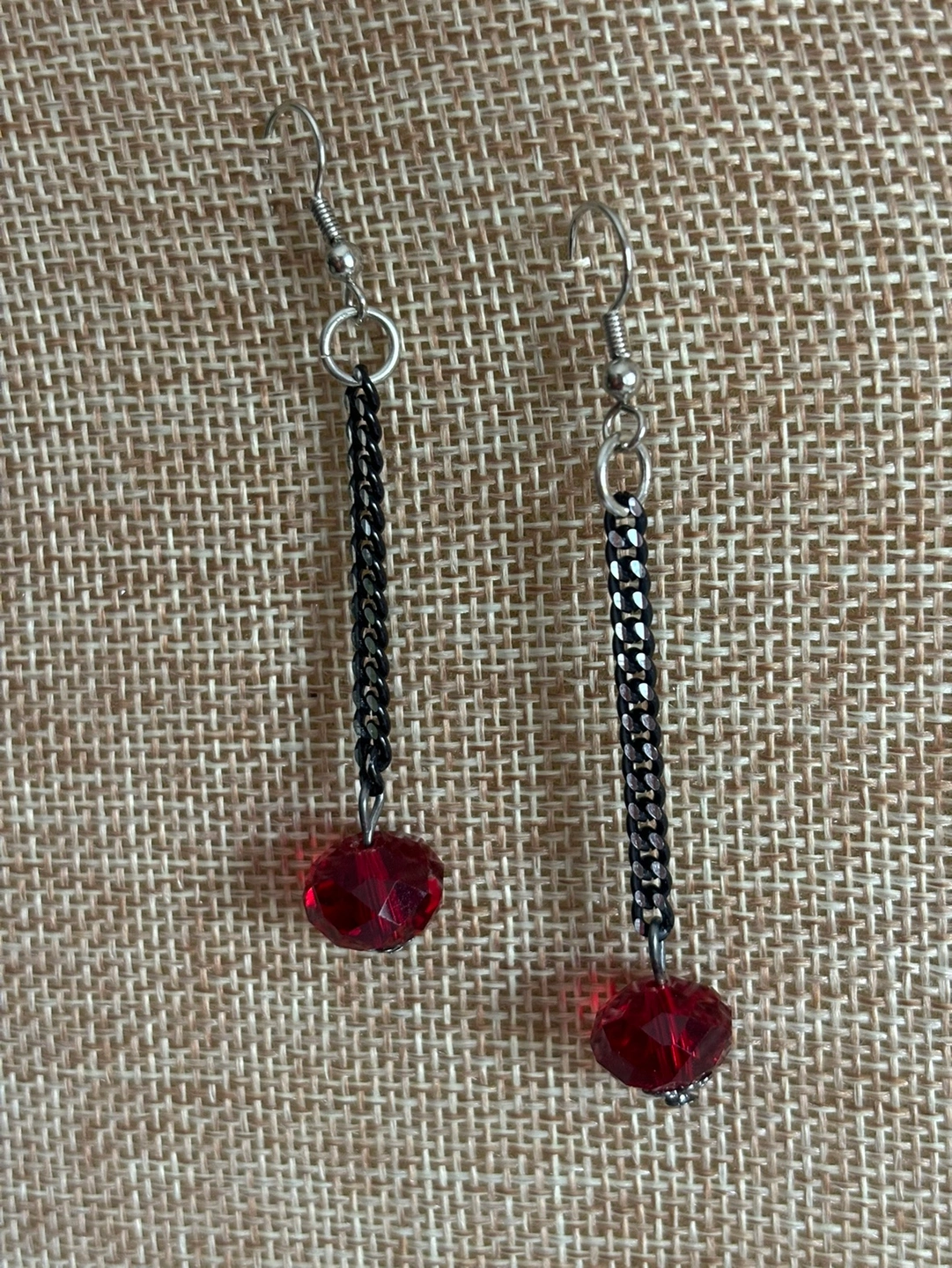 These earrings feature a red glass bead accented with silver metal and hanging from a black and silver chain. They have silver ear wires.