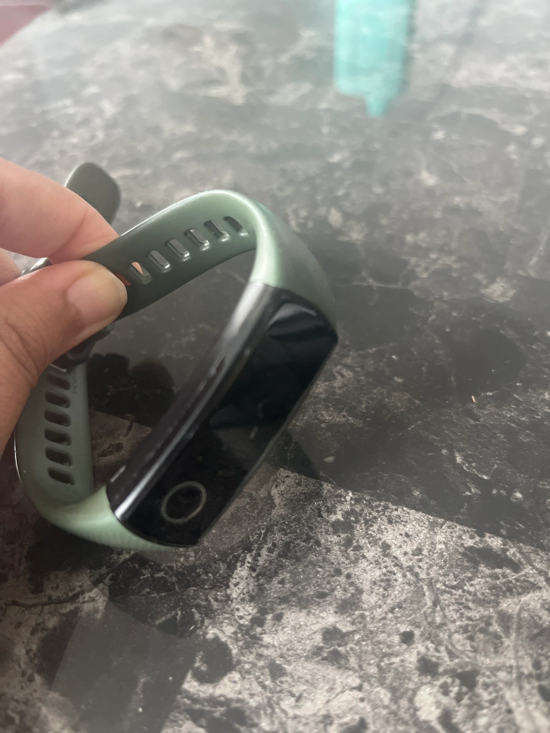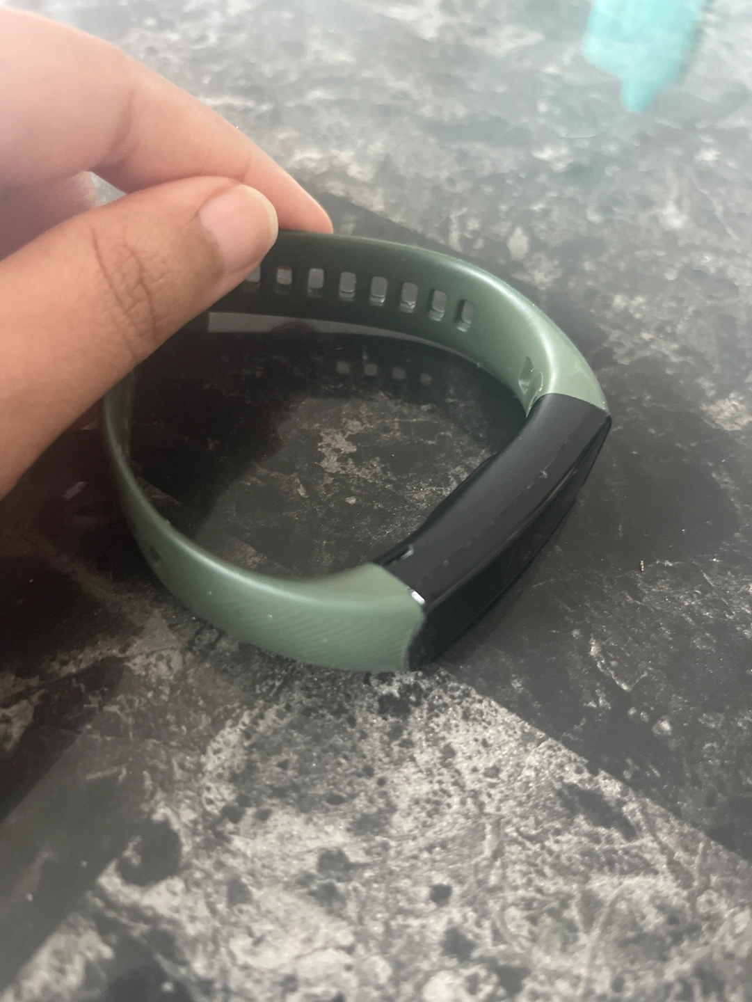 A gently used Honor Band 5 fitness tracker in olive green. The tracker features a colour screen and various fitness tracking capabilities. It includes the band shown.