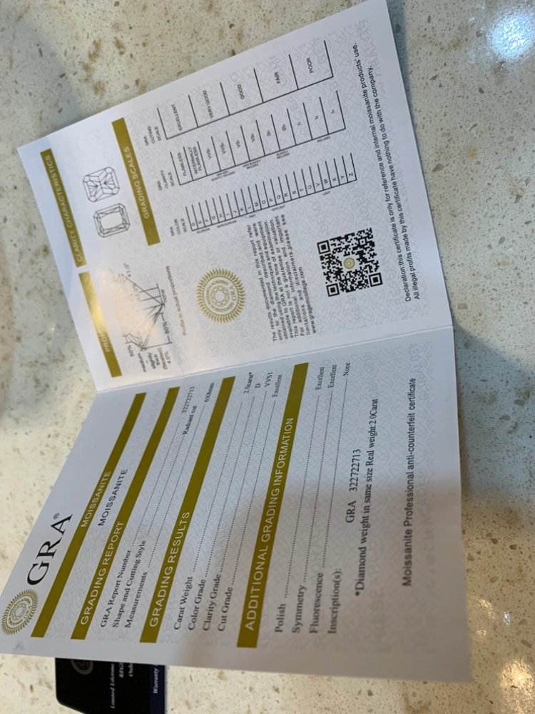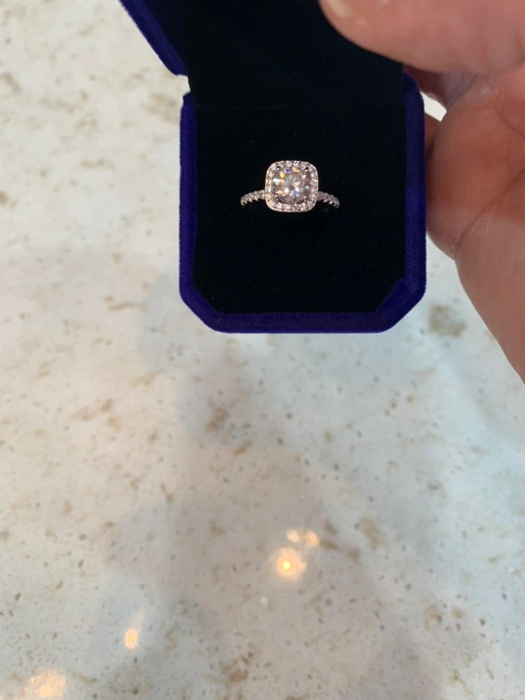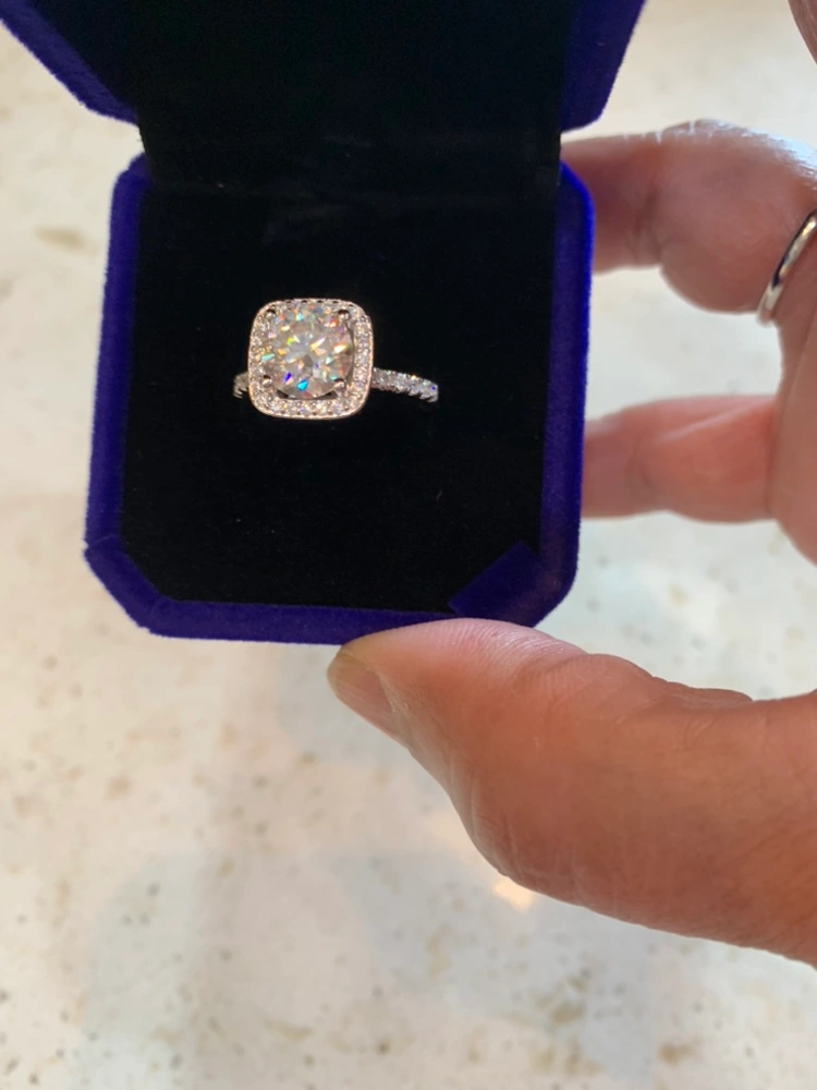 This is a beautiful, sparkly, and elegant moissanite engagement ring with a halo setting. It comes with a certificate of authenticity. The centre stone is a cushion cut, and the ring is set in silver. This ring is perfect for any engagement or special occasion. The ring size is 7