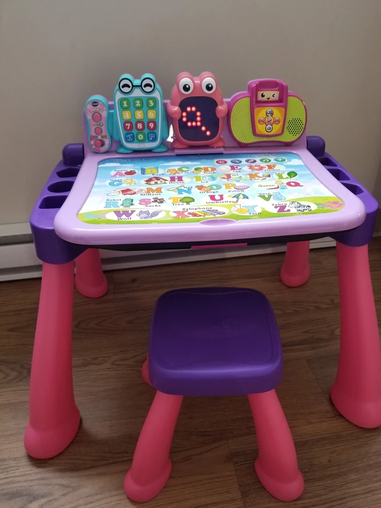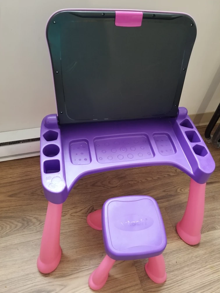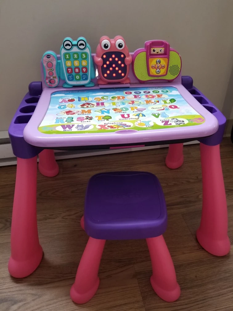 This VTech learning desk comes with a matching stool. It features a double-sided chalkboard and a variety of interactive activities. The desk also has a built-in storage compartment.