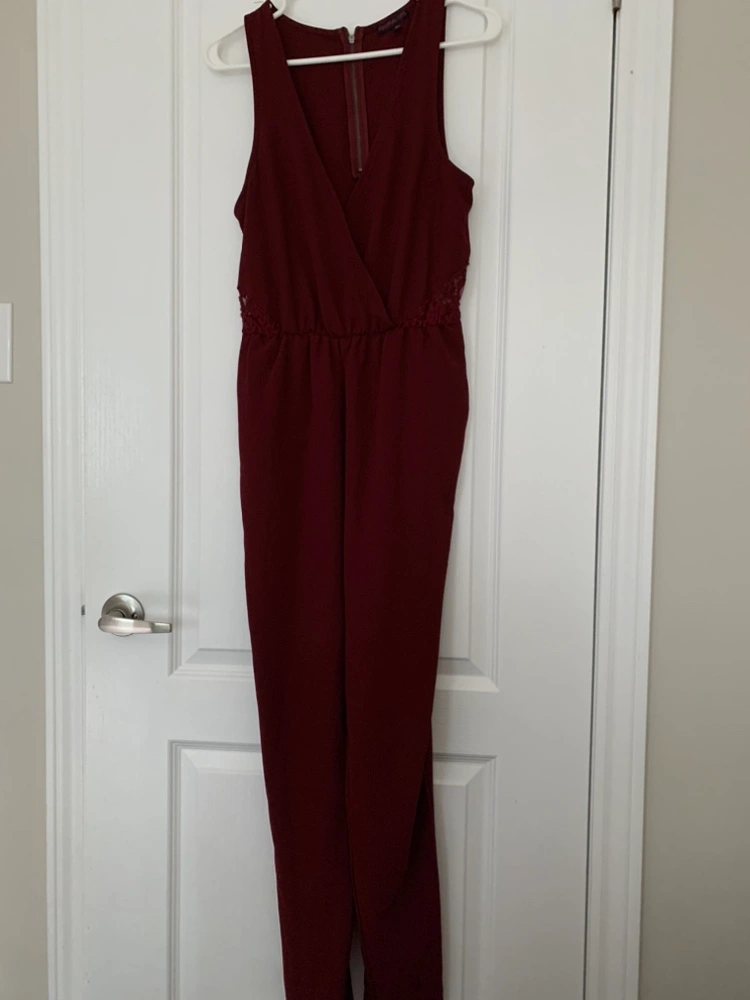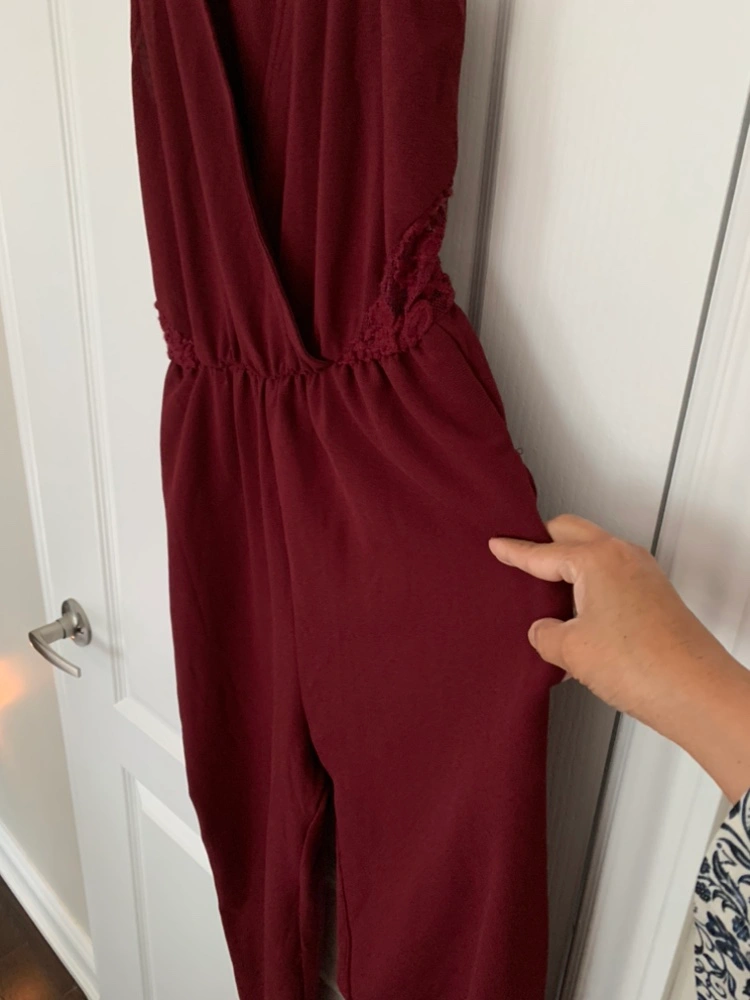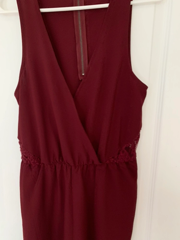 A burgundy jumpsuit with a v-neck and side lace detailing. The jumpsuit has a zipper up the back. It has pockets on the side. The fabric is a soft and flowy material.