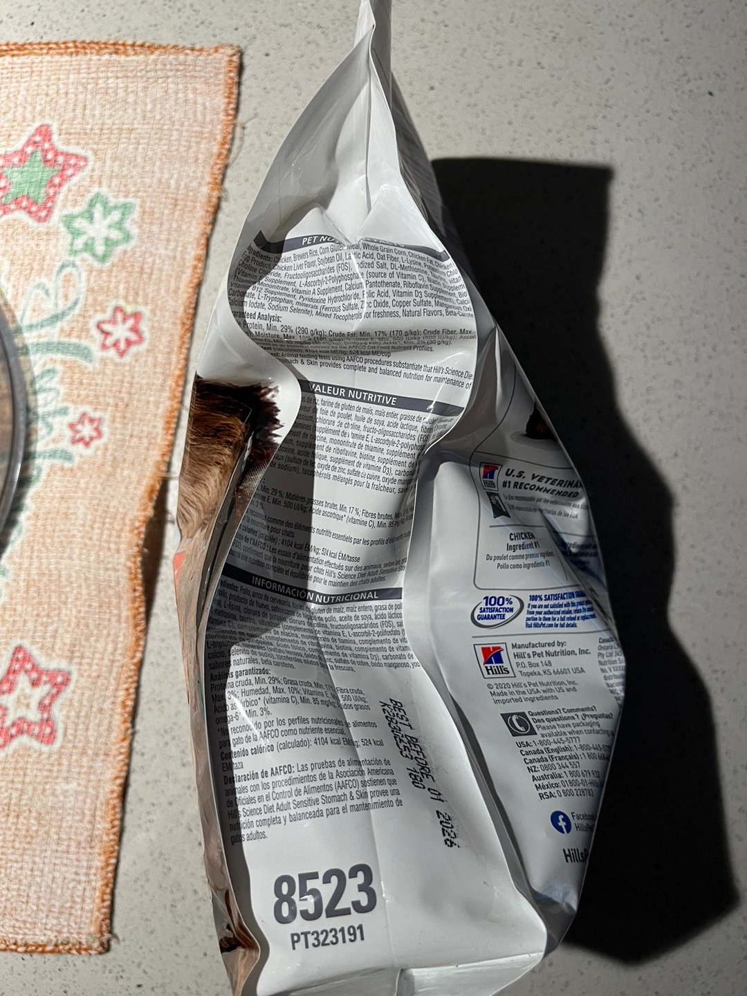 This is a bag of Hill's Science Diet Sensitive Stomach & Skin Adult dry cat food. Unopened, our vet changed our diet. Can’t return.
