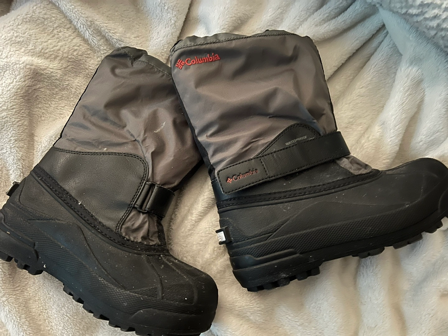 70Black winter boots with a grey upper. They have velcro closures and a waterproof membrane.
