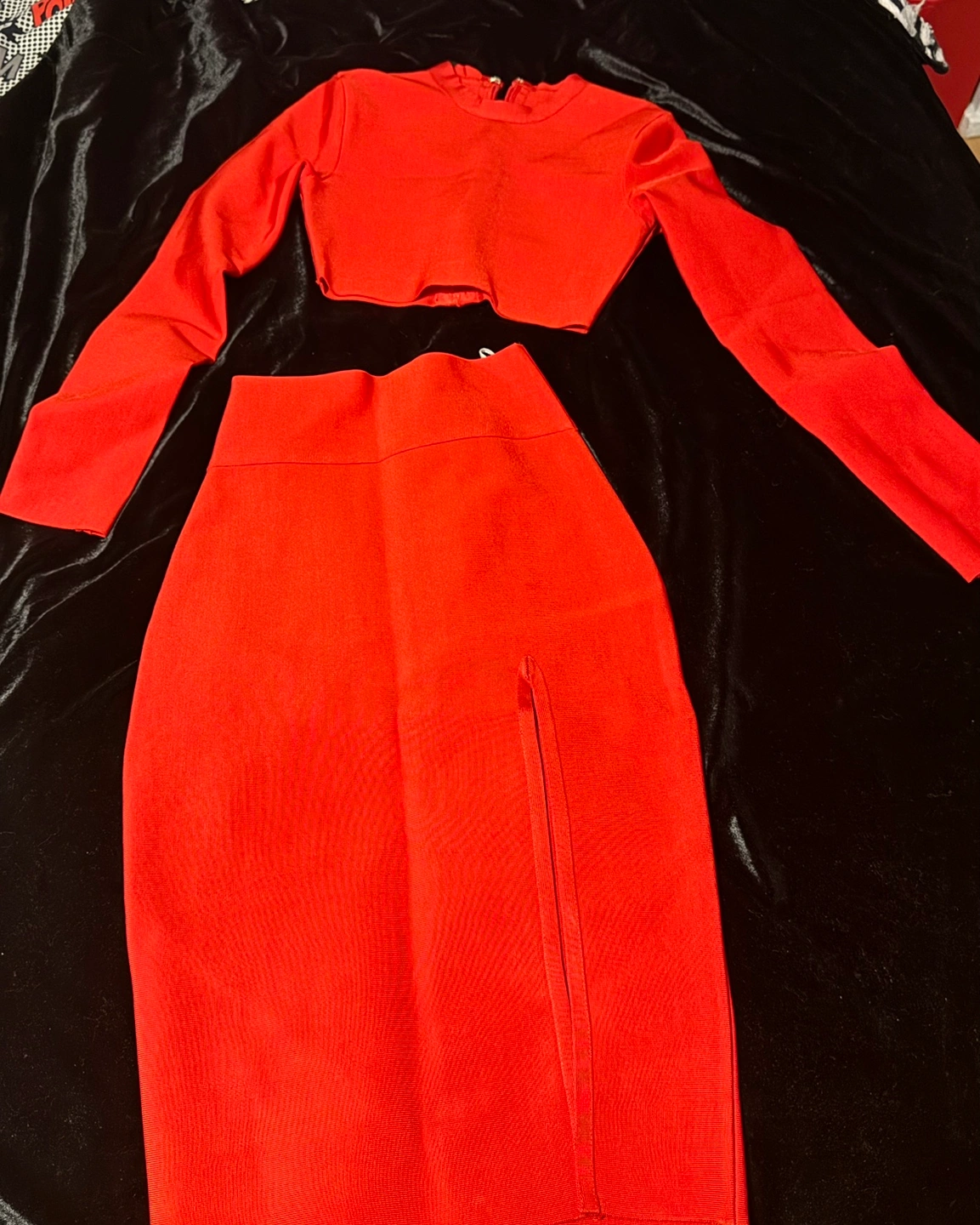 This set is a size medium and is made of a stretchy, comfortable material. The top is cropped and has long sleeves. The skirt is a pencil skirt with a slit on the side.