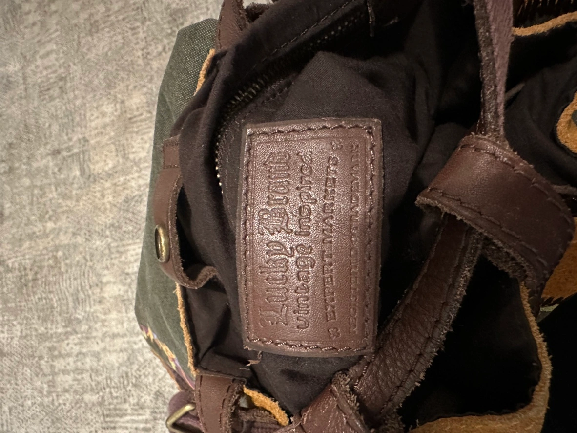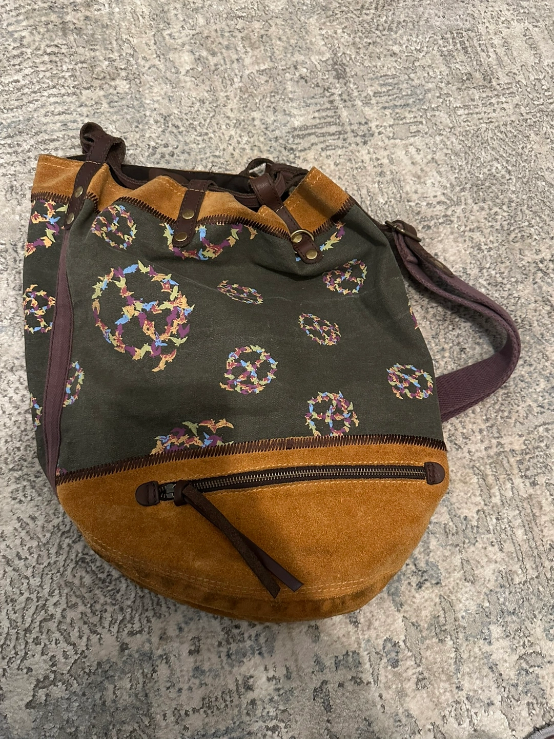 A vintage inspired bag from Lully Brown. The bag is green and brown with a peace sign pattern and has a brown suede bottom. It features a zipper closure and adjustable strap.