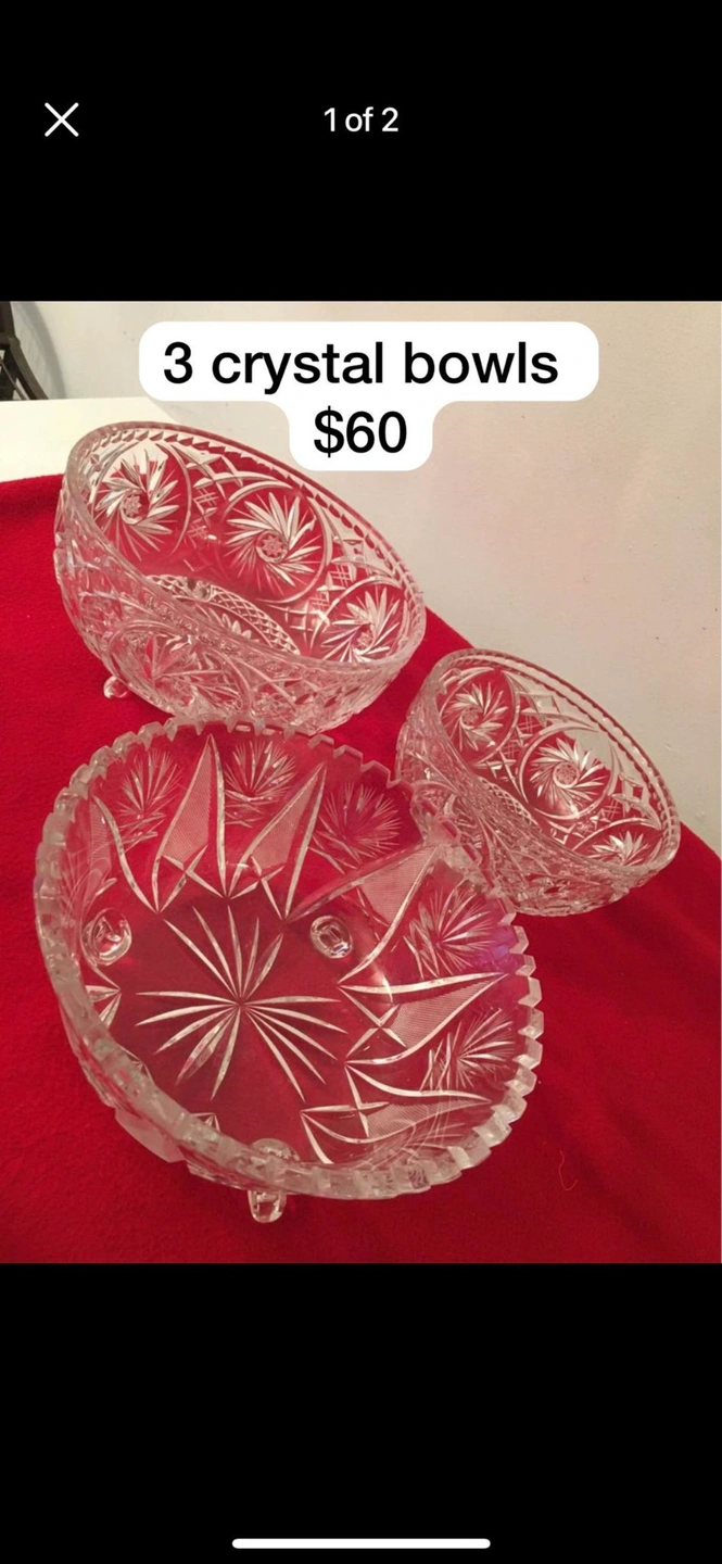 Three crystal bowls with a cut glass design. . The bowls are in good condition. They would look beautiful on a table or in a hutch. They are a nice size and would be ideal for serving fruit or nuts. Each for $20