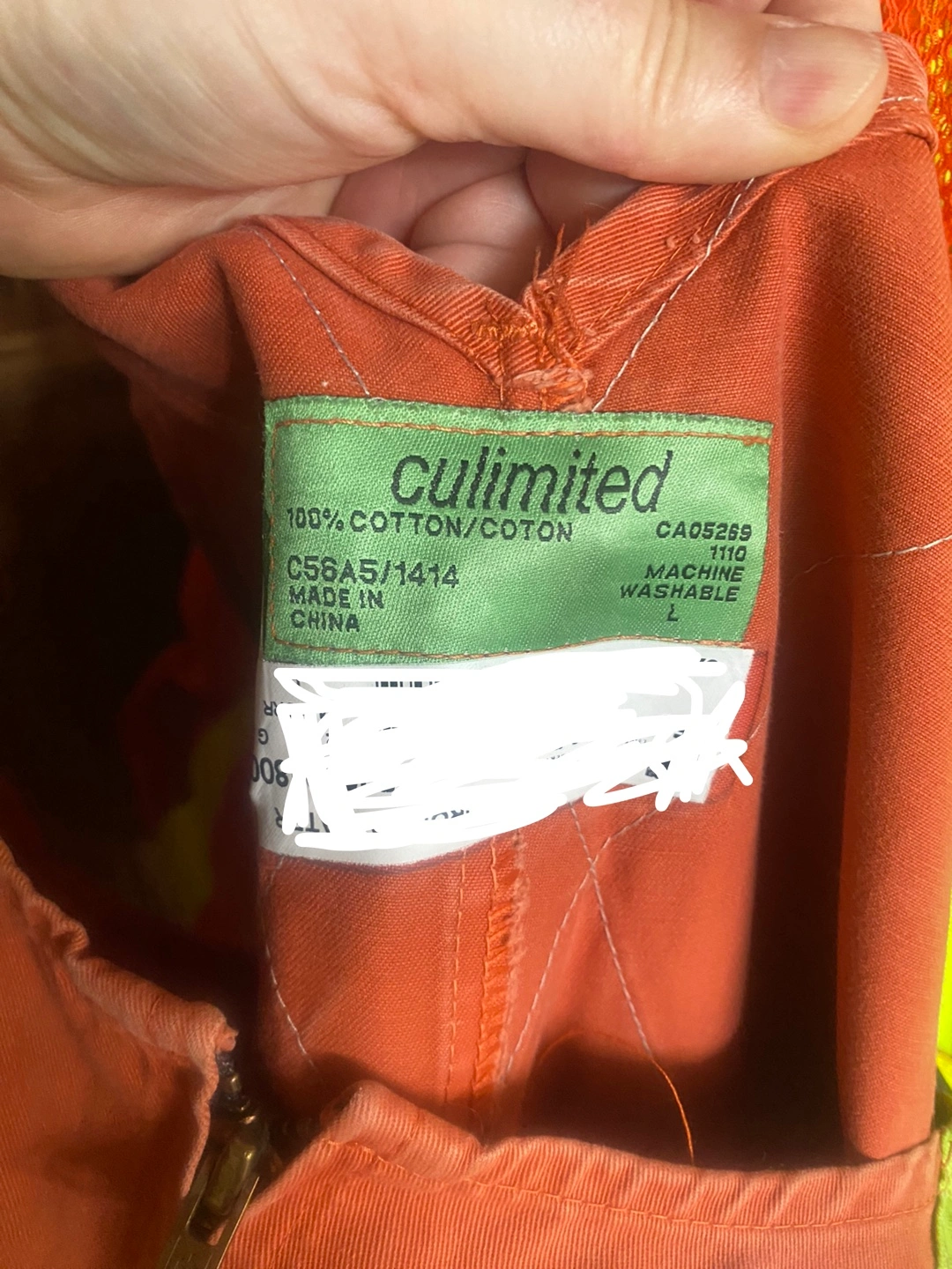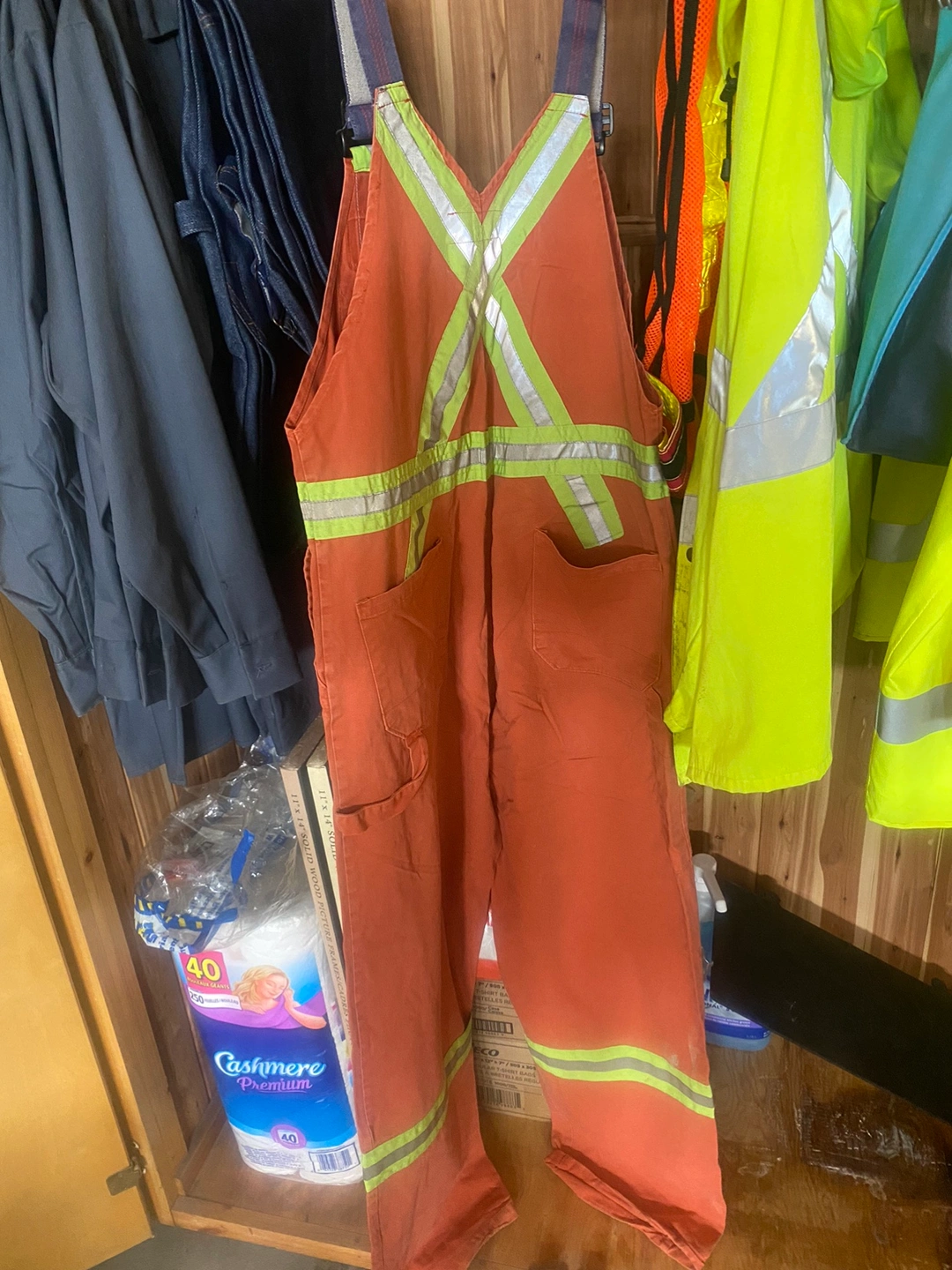 13Used orange work coveralls with high visibility reflective tape. Size Large. Machine washable. Made in China. Has a zip up front. Has two side pockets and two back pockets. Has adjustable shoulder straps. Comes with a "Toronto Water" patch. Pick up near Weston Rd and Wilson Ave or Yonge and St. Clair ave. I have more construction work safety clothing and accessories available for sale.