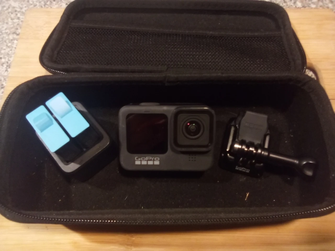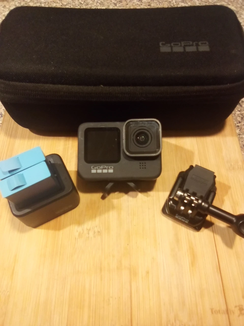 Selling a GoPro HERO9 Black action camera. It's a complete package and includes the camera, batteries, a charger, a mount, and a carrying case.