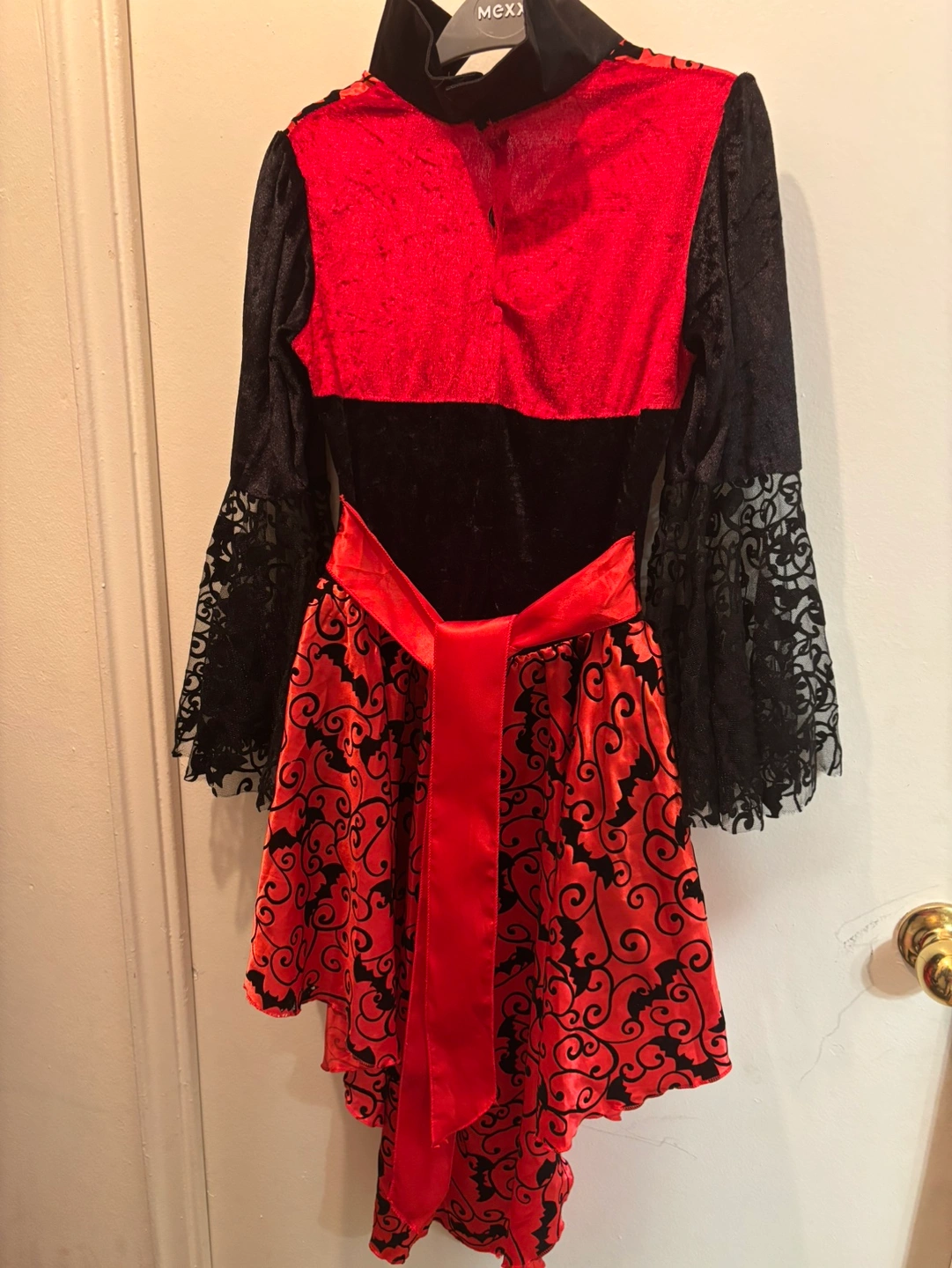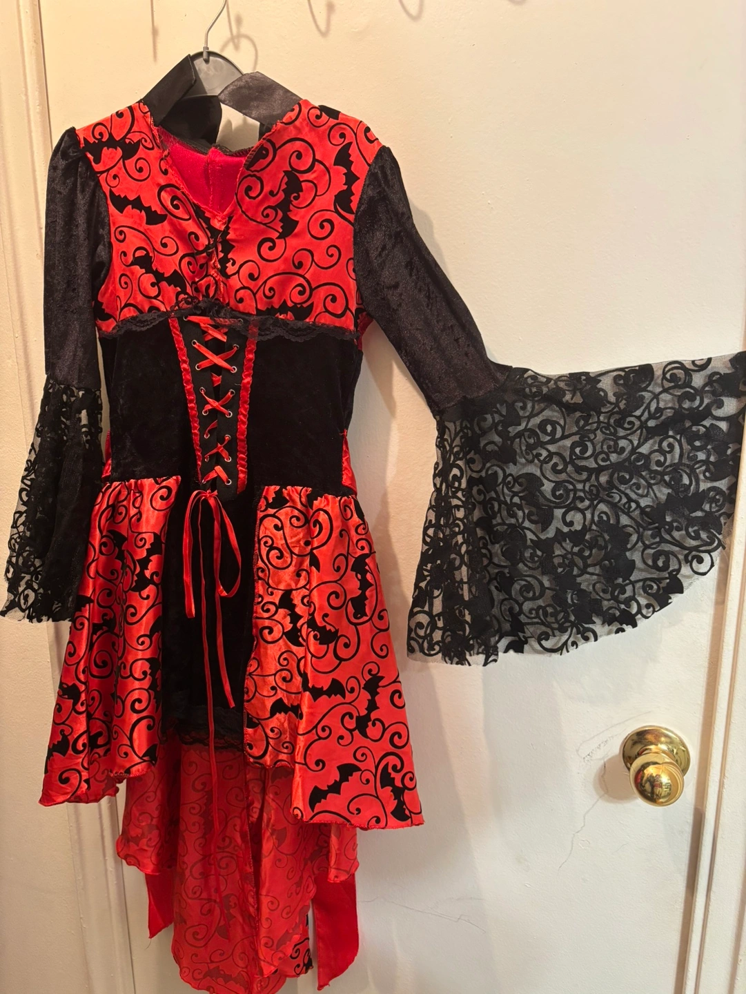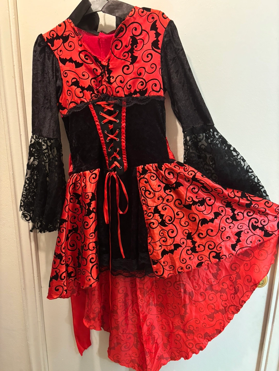 86Red and Black Dress with Bat Design. Lace sleeves and a red ribbon. Has a corset-style bodice that laces up the front. SMOKE FREE AND PET FREE HOME. CASH only please.