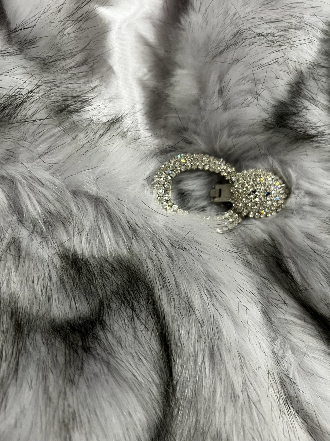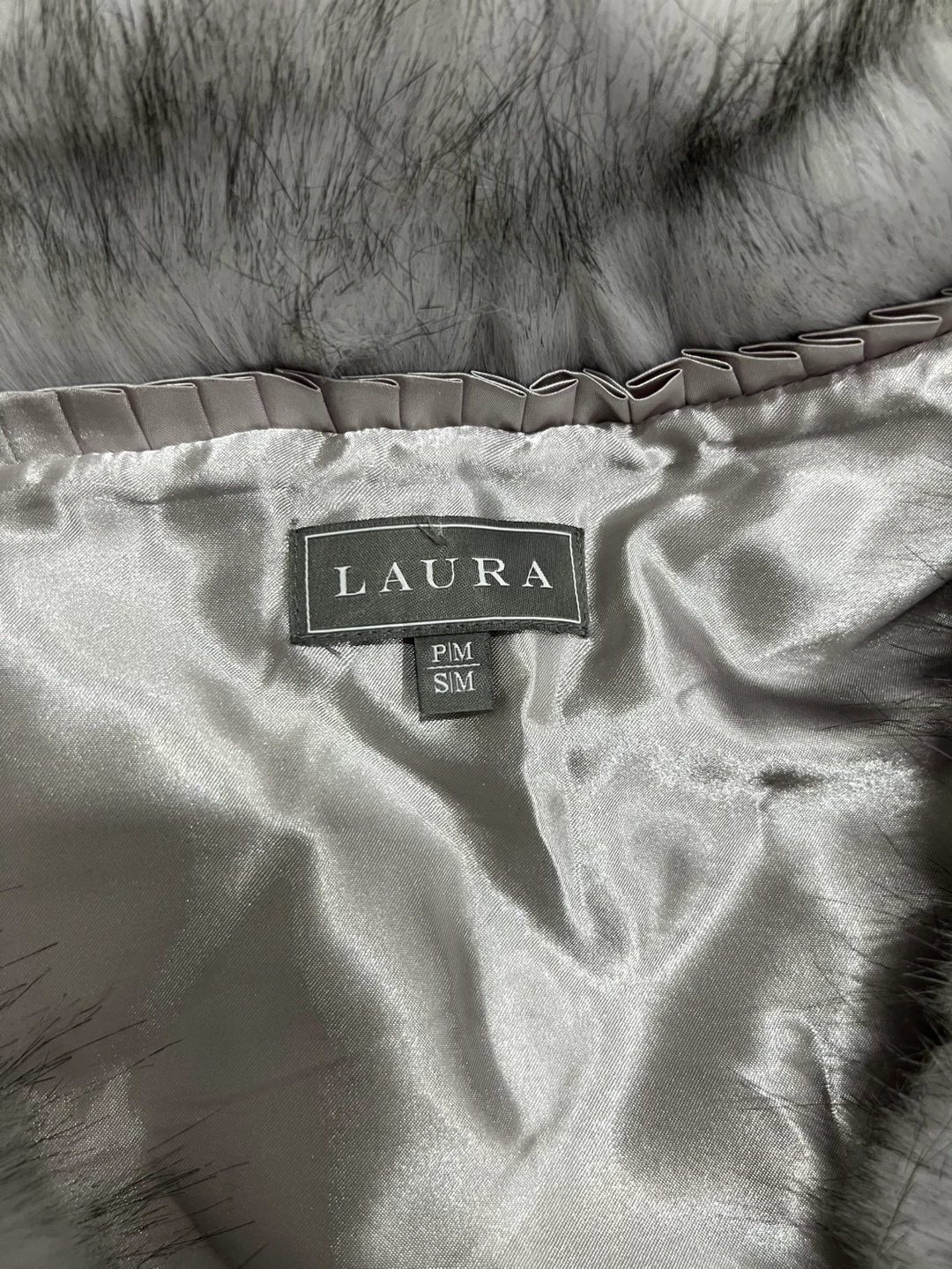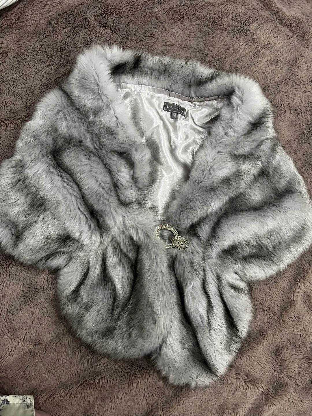 Laura brand faux fur wrap with a rhinestone closure. It has a satin lining. The size is listed as PM/SM. The colour is grey.