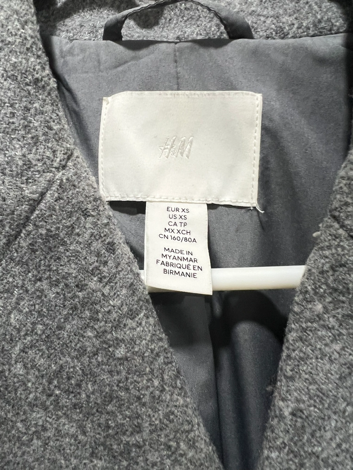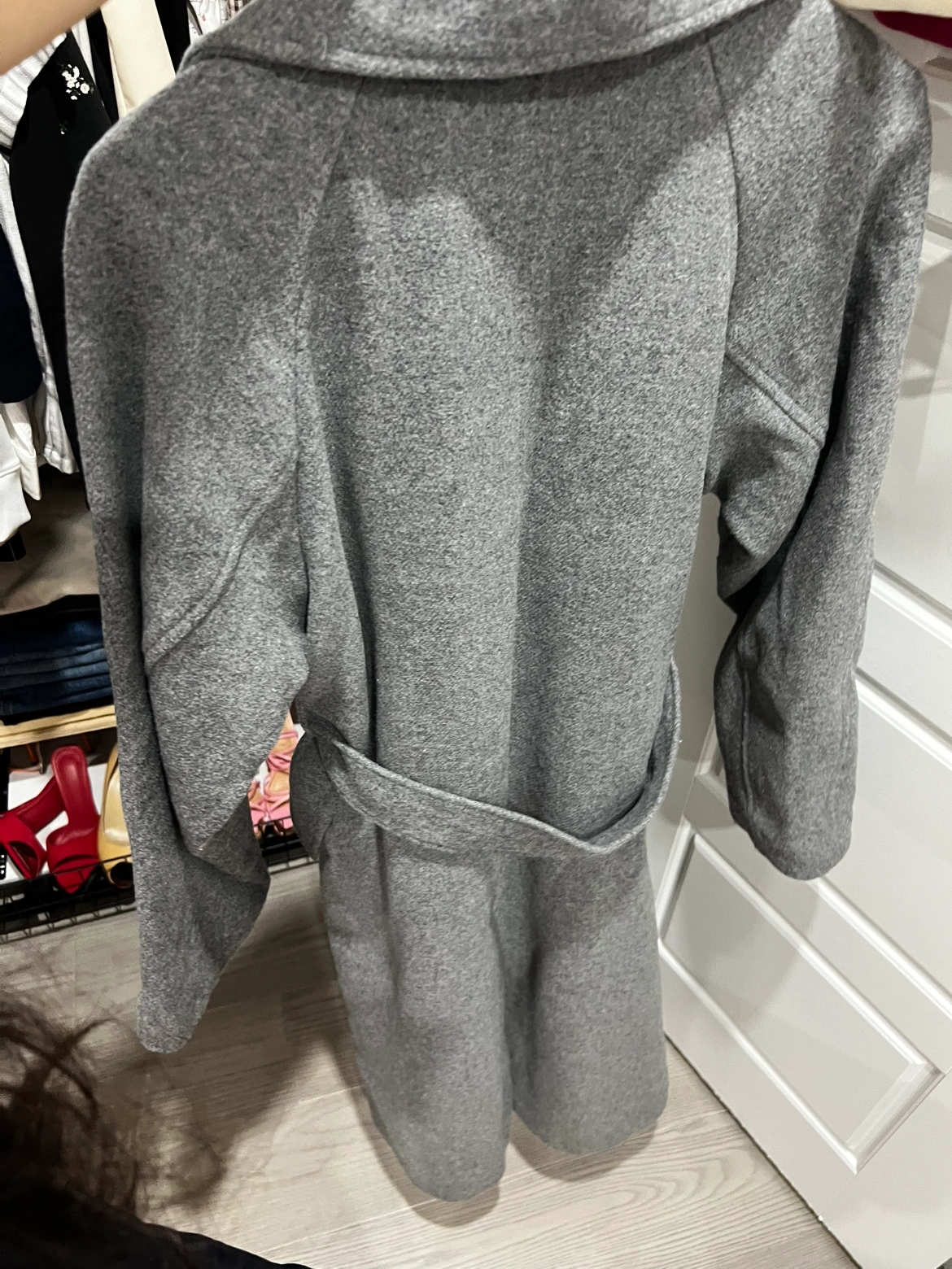 A grey wool coat with a belt, double-breasted closure, and long sleeves. The coat has two pockets. It is in size XS. It is made in Myanmar.