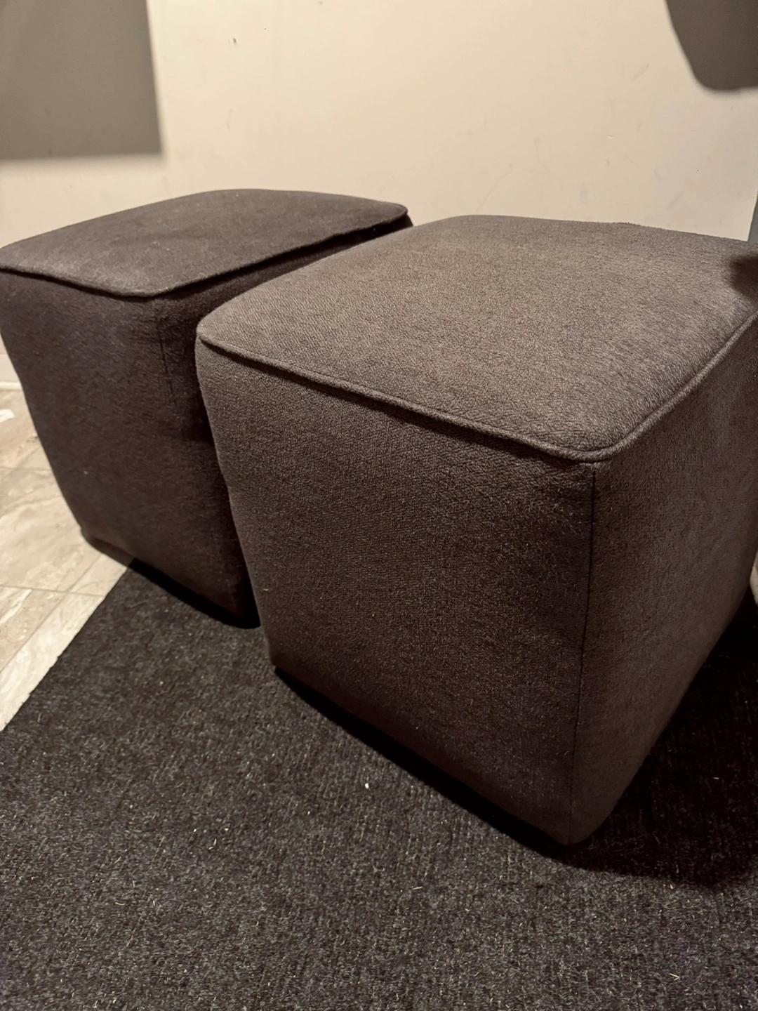 Two matching grey fabric ottomans. They are cube shaped.