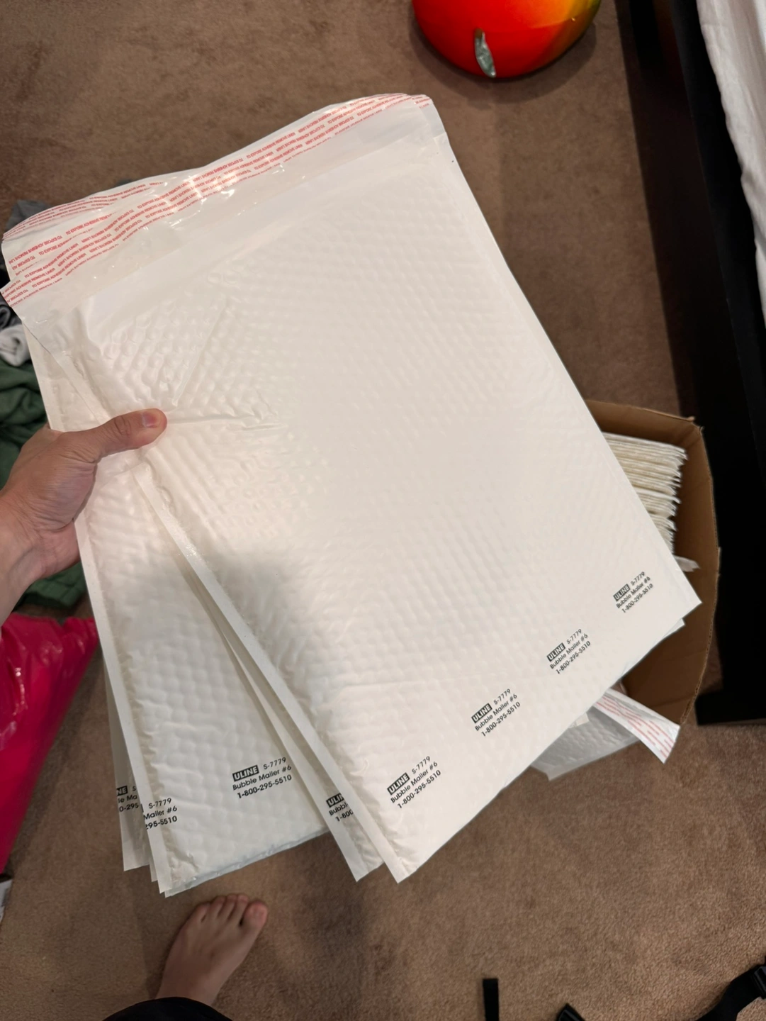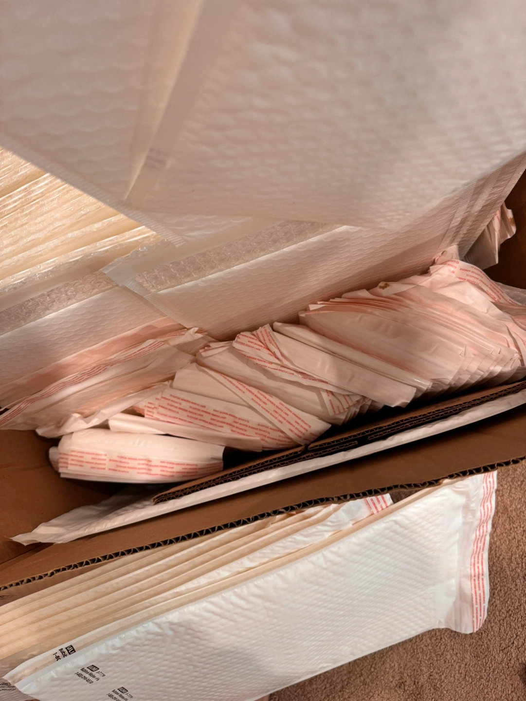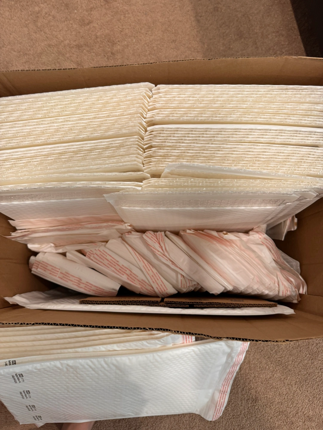 A box of bubble mailers, perfect for shipping small to medium-sized items. $30 for entire box