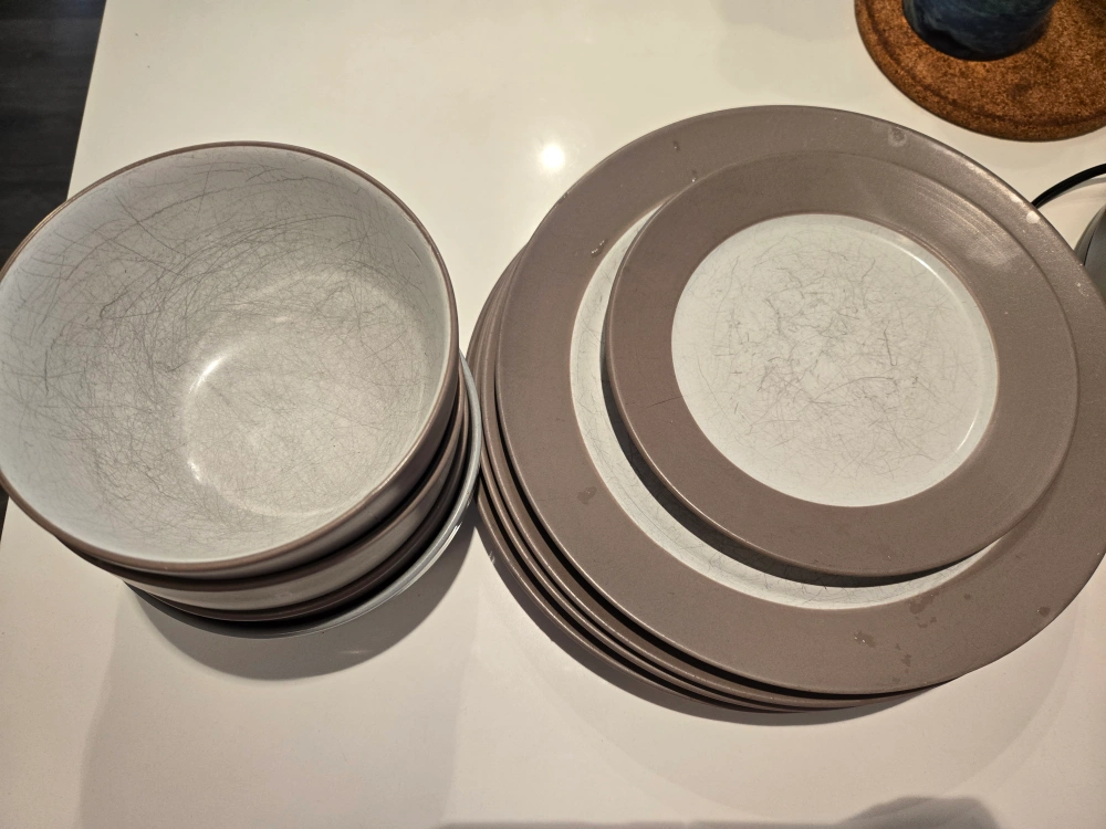 Set of 4 brown and white dishes, including a bowl and three plates. The plates are stacked on top of each other.