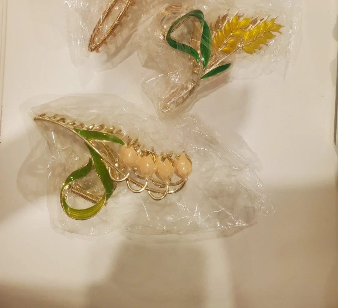 Set of 3 decorative hair claw clips. Each clip is made of metal. There is a gold-coloured base with a decorative design on each. Brand new, still in packaging.