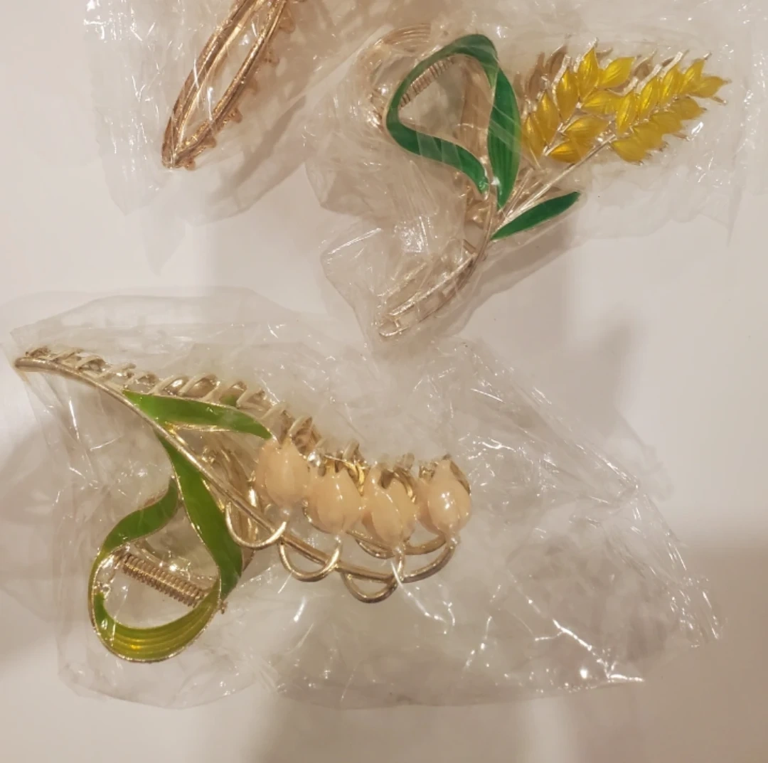 Set of 3 decorative hair claw clips. Each clip is made of metal. There is a gold-coloured base with a decorative design on each. Brand new, still in packaging.