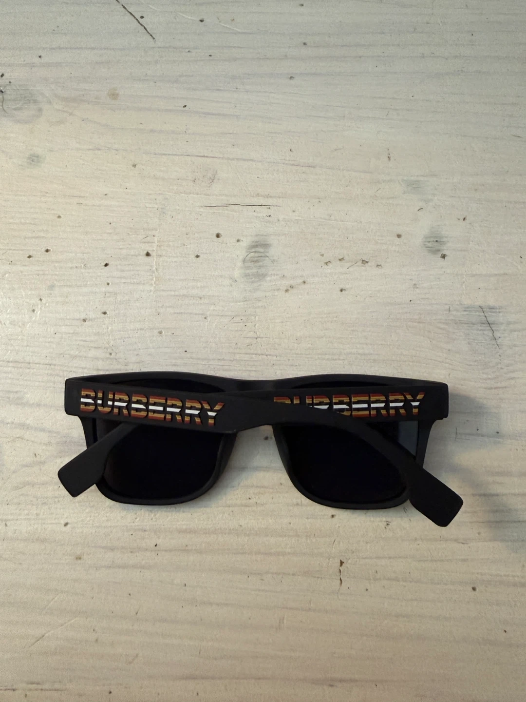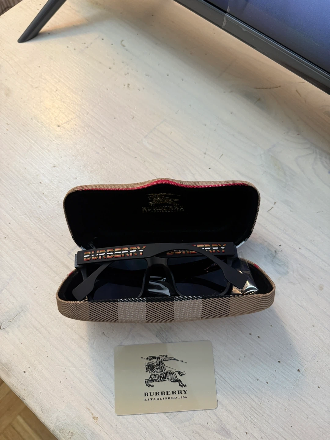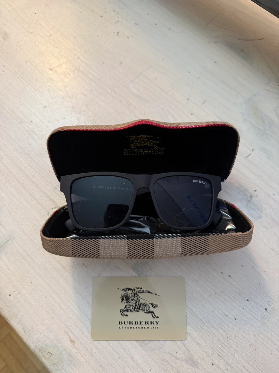 Black Burberry sunglasses. Made in Italy. Comes with a patterned hard case and authenticity card. It's a stylish accessory for sunny days!