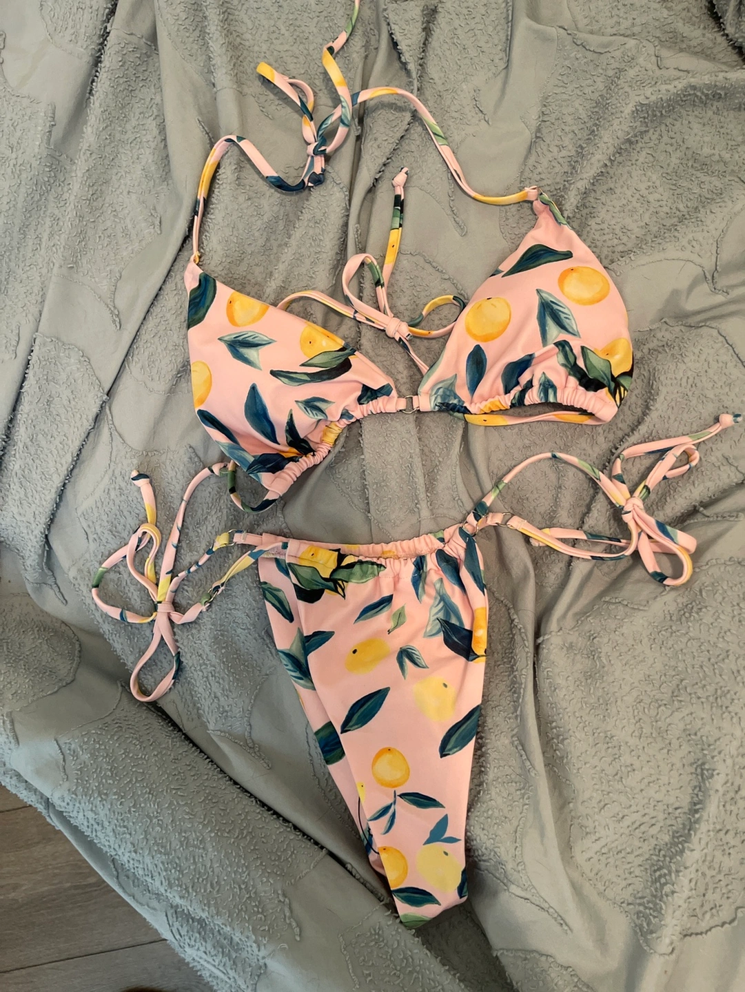 Two piece bikini with a pink background and lemon and leaf pattern. Super chic and cute!
