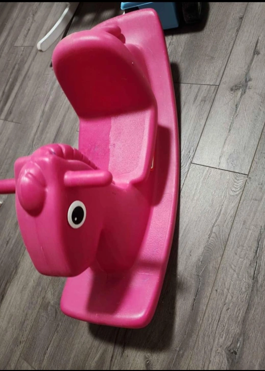 A rocking horse for children. It is pink with a white eye and is made from plastic. The horse is ready for a new home! Used Good Condition BF.SF. Pet friendly home Pickup in Lindenwoods