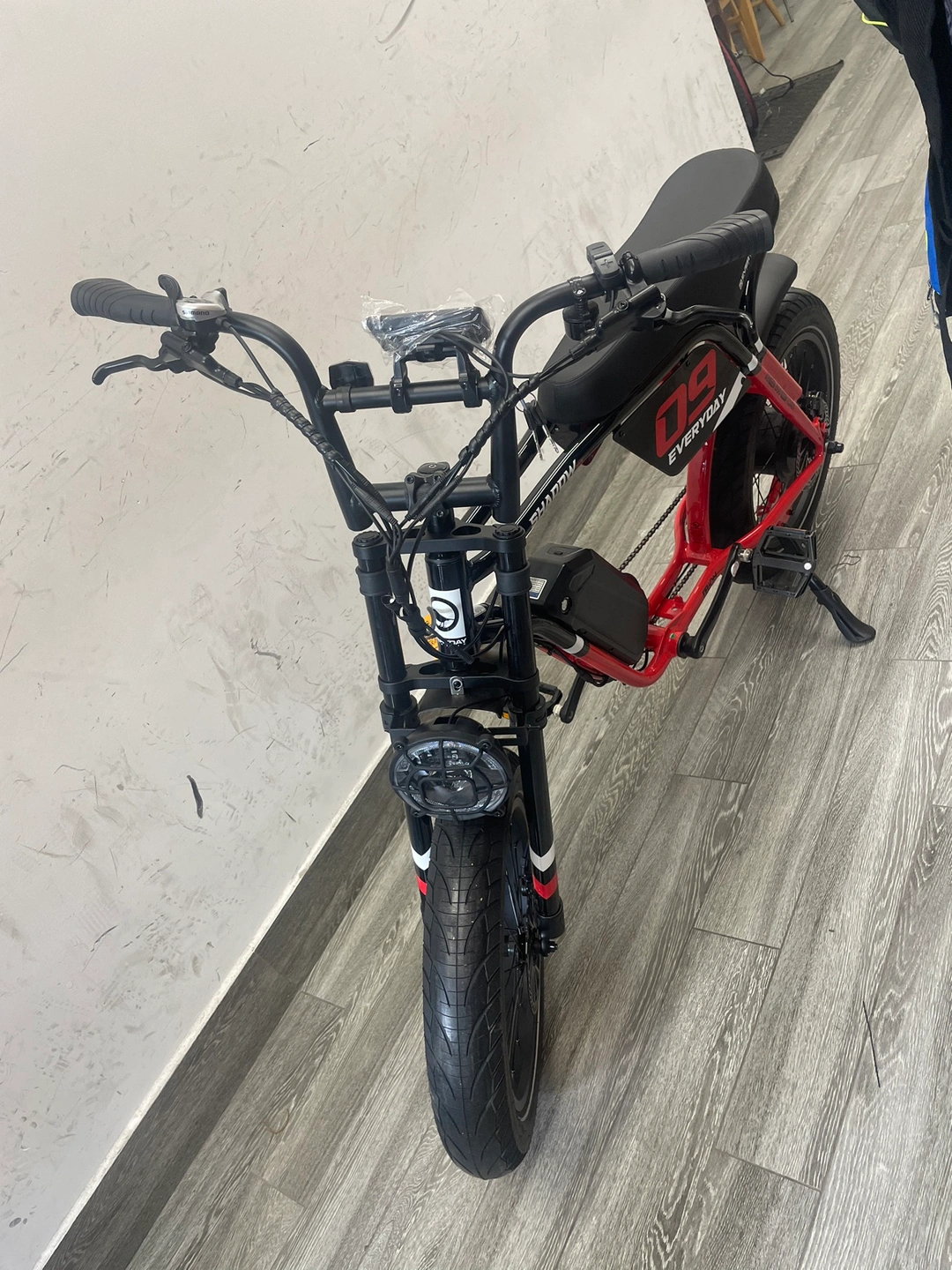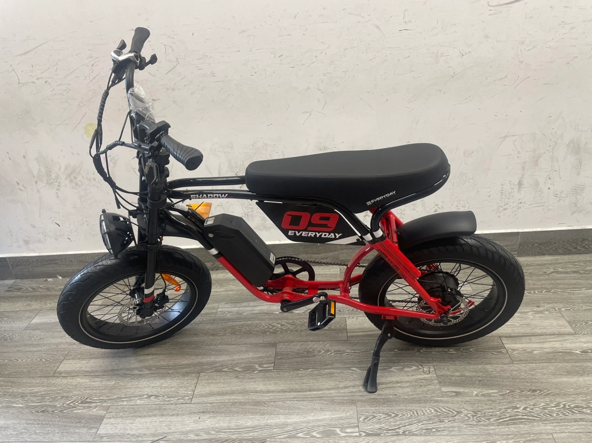 Electric bike with thick tires and black and red colour scheme. Has a front light and rear brake light. Has a digital display. Includes a kickstand. Comes with a battery. The bike has a padded seat and handlebars. It has a chain. Has a motor on the rear wheel. It is a good bike for commuting around the city.