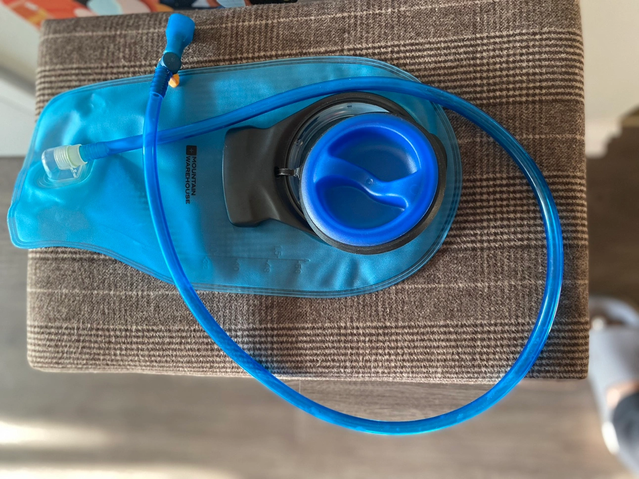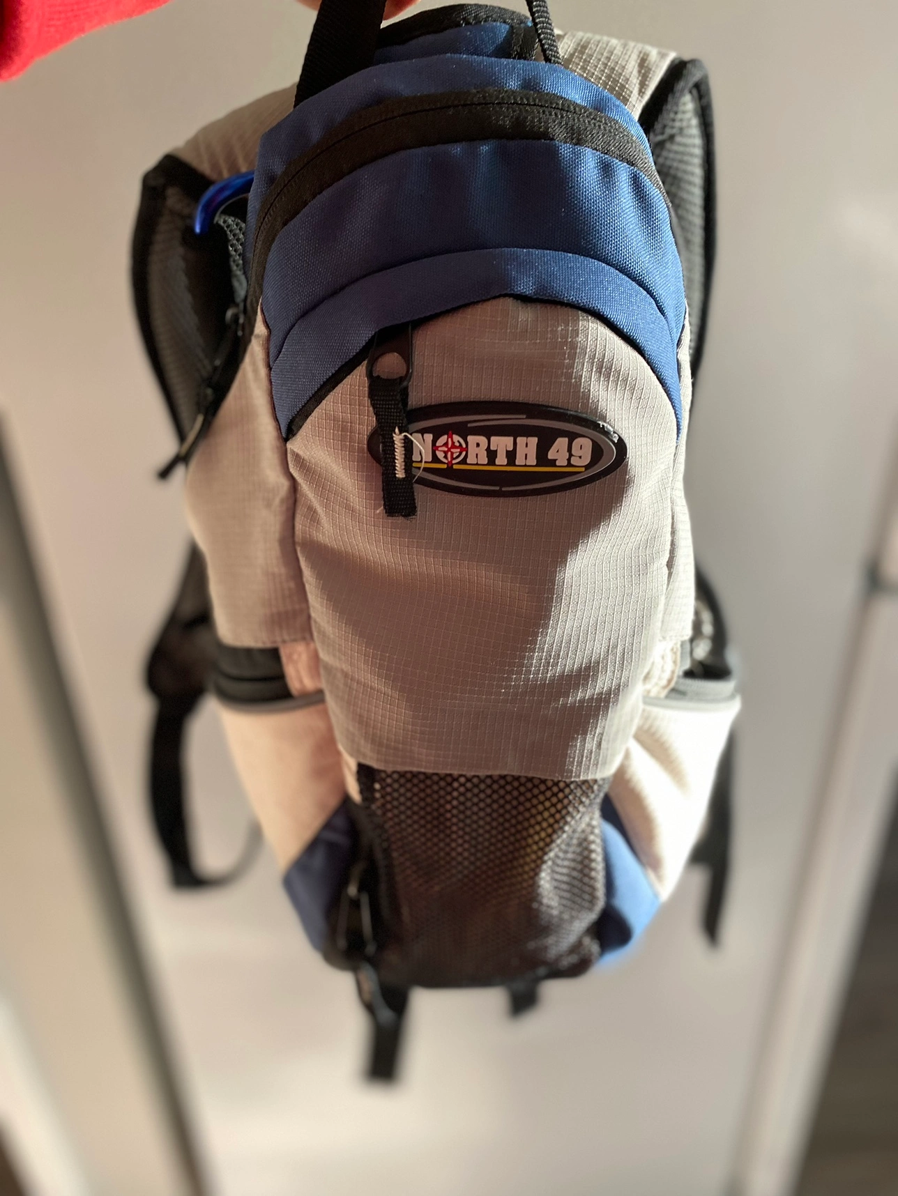 This backpack includes a hydration bladder. The backpack has multiple pockets and straps. The bag is in a gray, blue, and black colour scheme. It has a mesh back for breathability.