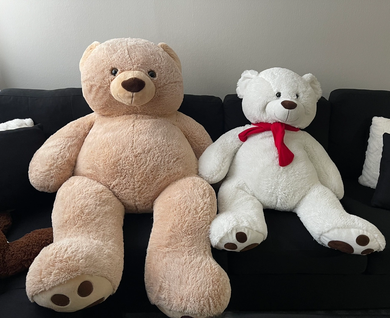 The beige bear measures 1.33m tall and the white bear measures 98cm tall. Both bears are very soft and cuddly. They are perfect for cuddling, decorating. From non smoker home.