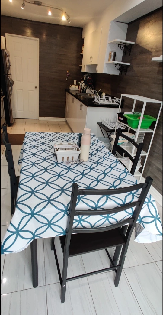 133This set includes a table and four chairs. All pieces are black with a wood-like finish. Only 1 year old, moving out Sale 5 piece Metal Dining Set, dining table and dining chairs Pick up only