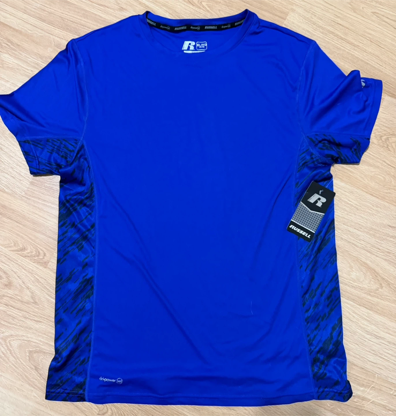 Russell Athletic men's training t-shirt in blue. Dri-Power 360 technology helps manage moisture. Size XL