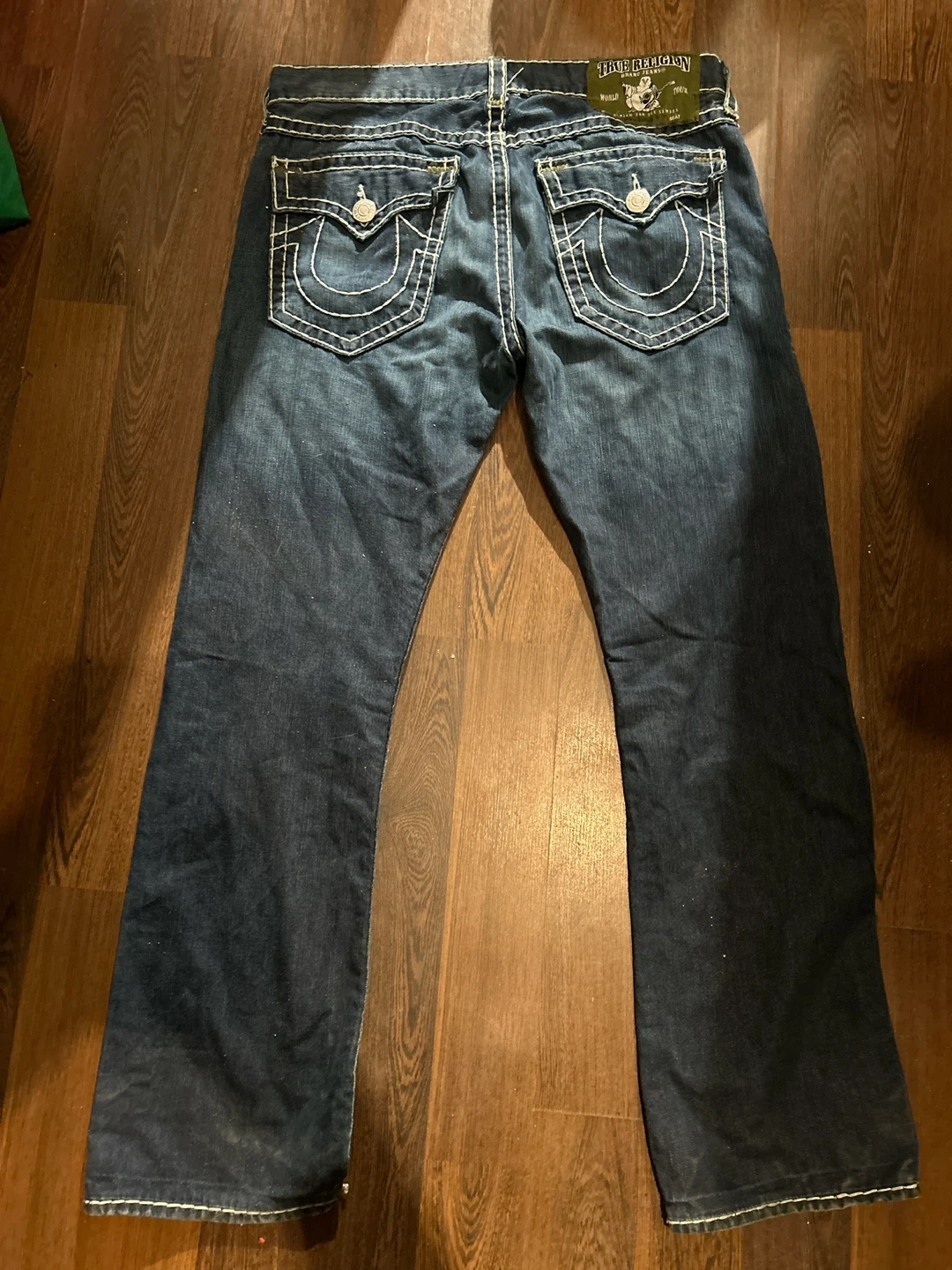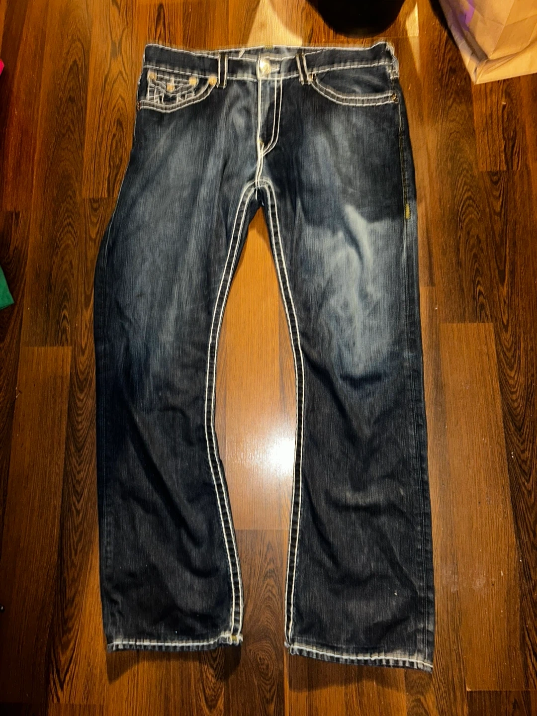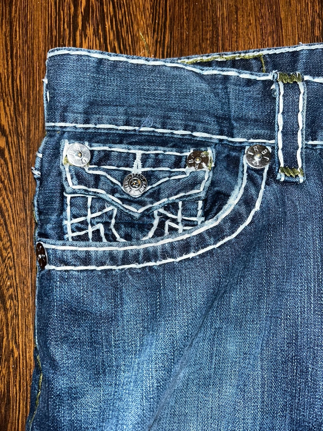 Classic World Tour, True Religion denim jeans with white stitching detail.