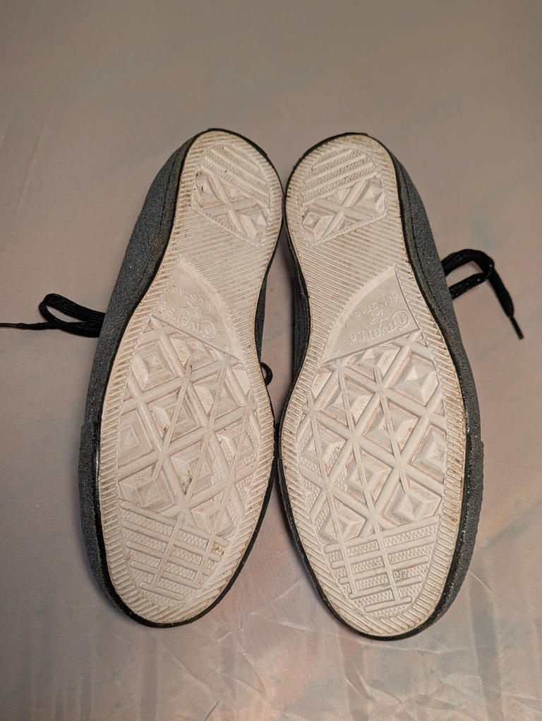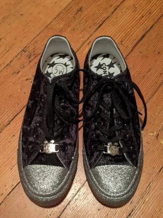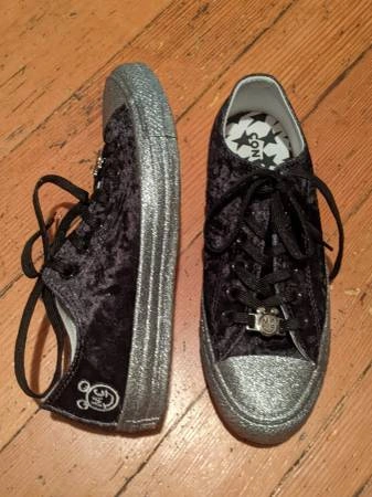 Ladies size 8 black crushed velvet with silver sparkle trim. Converse x Miley Cyrus limited edition shoes.