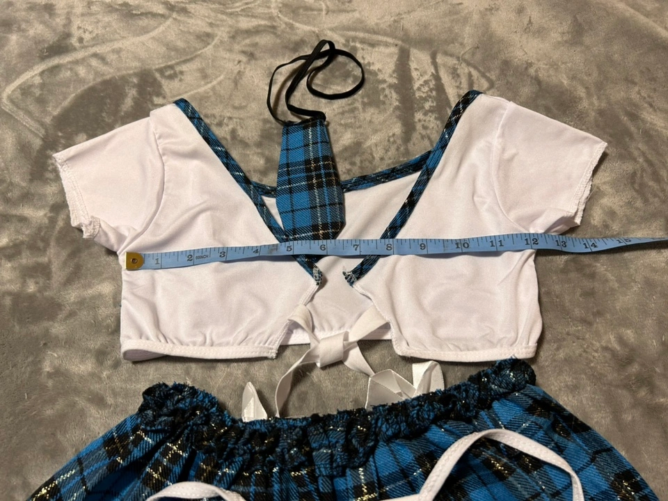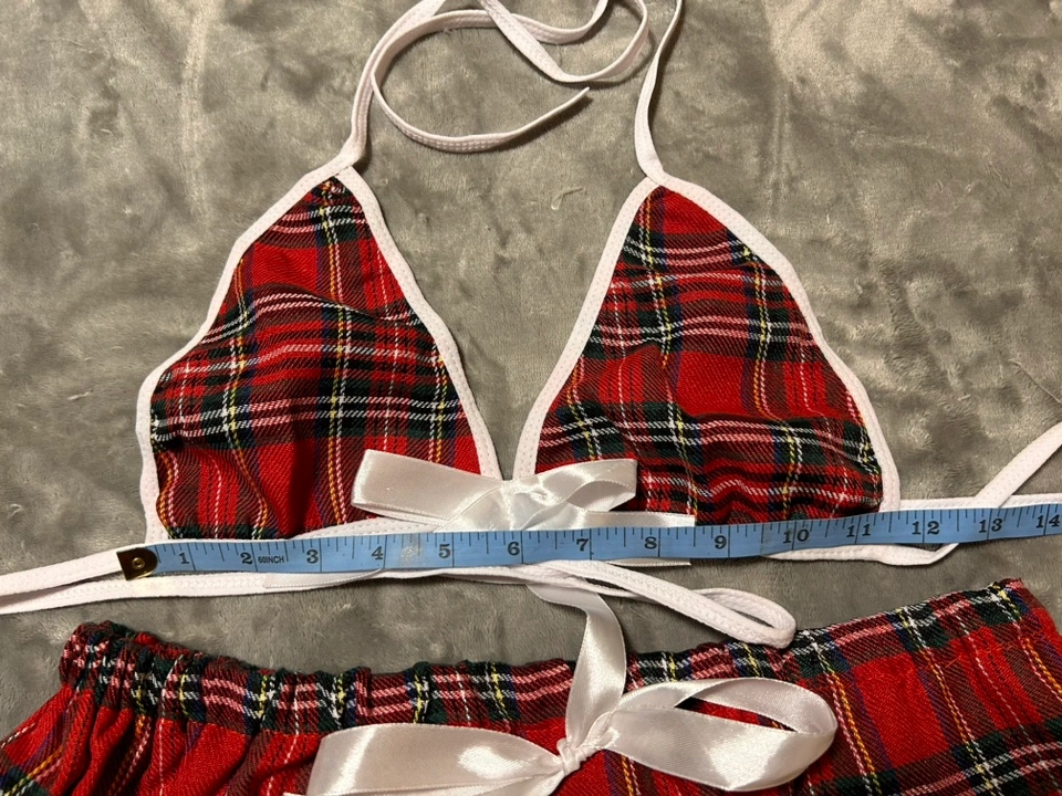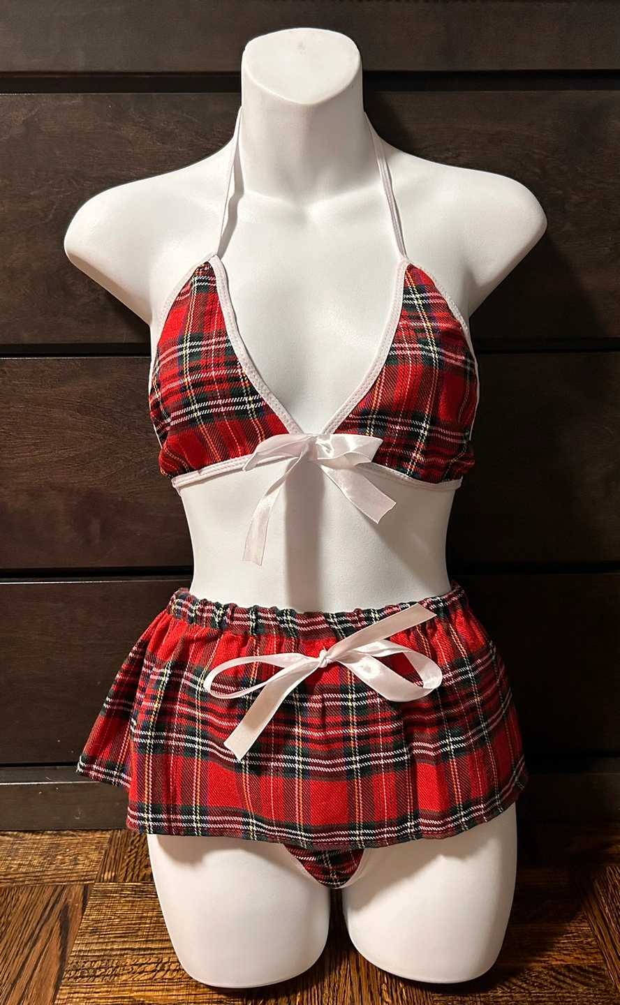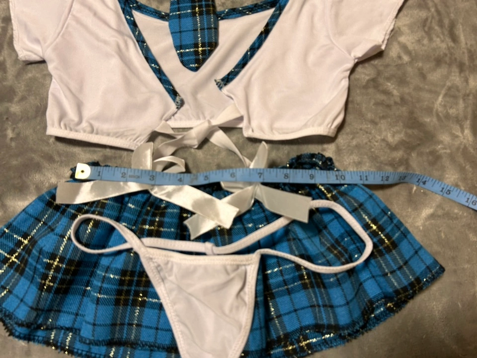 Includes top, neck tie, mini skirt and thong