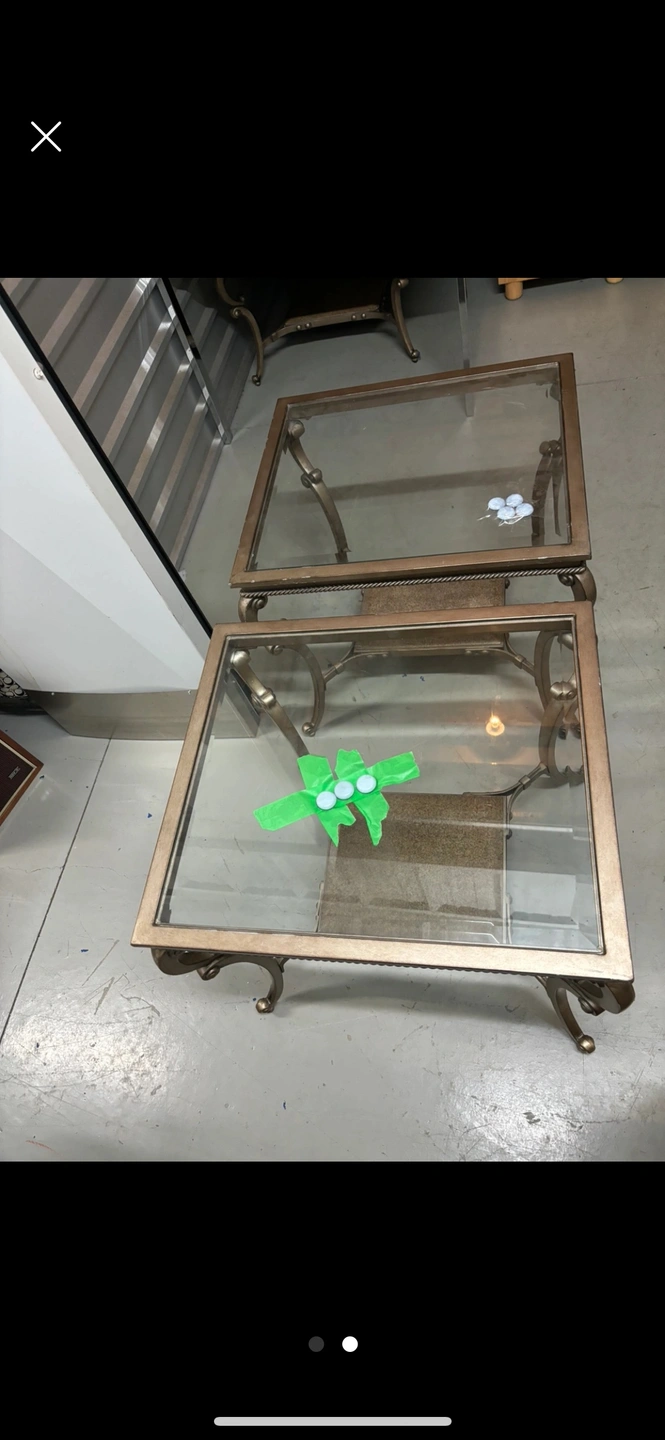 This set includes a coffee table and an end table, each with glass tops and ornate metal frames. They are in great shape and would be a beautiful addition to your home. Both two small table can be in the side of your couch and the other one as the center peice