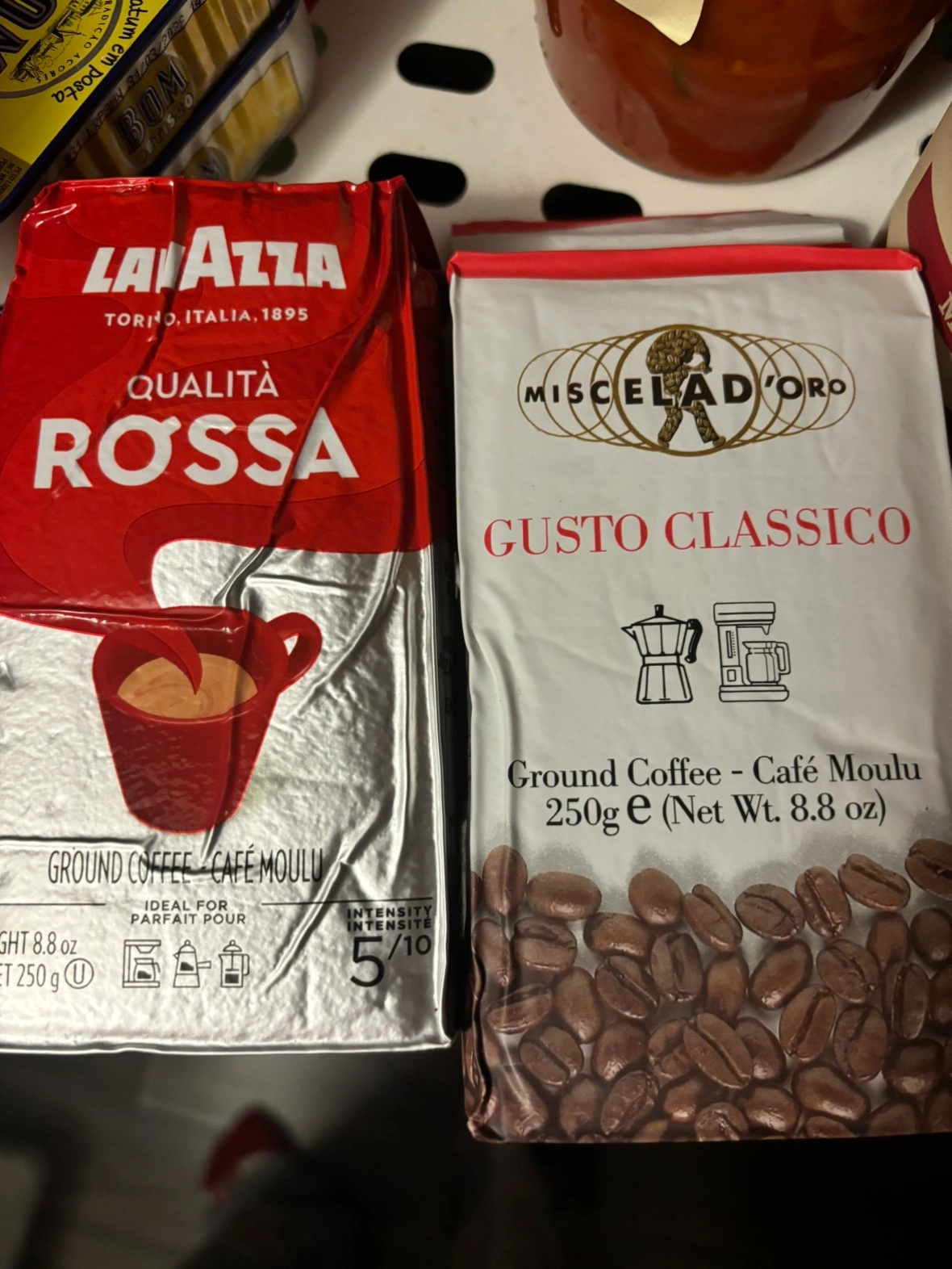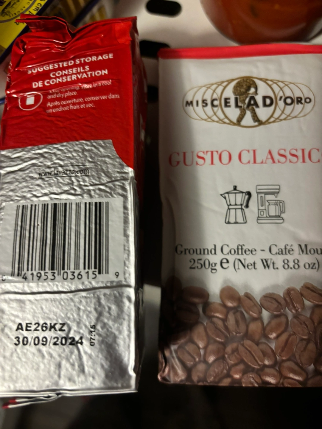 A bundle of three bags of ground coffee. There are two bags of Lavazza coffee and one bag of Delta Roast Portugal coffee. The bags are all unopened. Pick up Etobicoke price for all