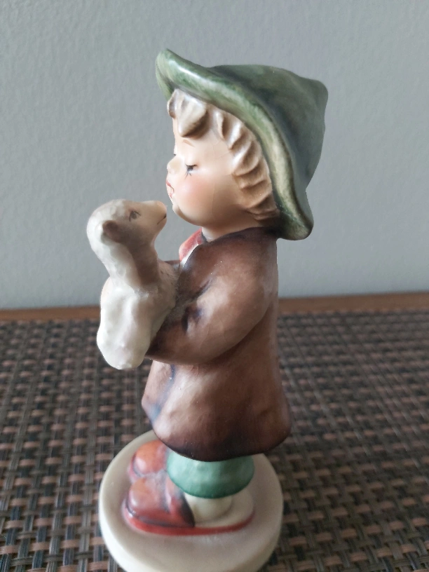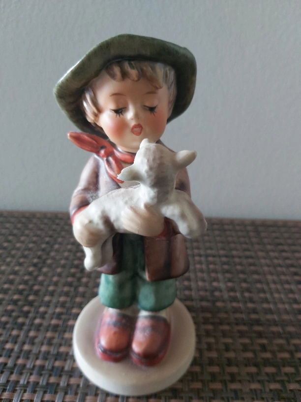 This is a vintage Goebel Hummel figurine of a boy holding a lamb. It is in good condition. The figurine is approximately 6" tall.