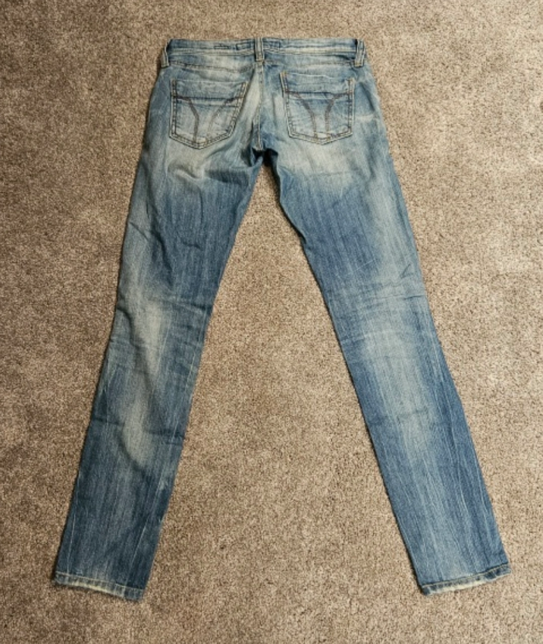 These are blue skinny jeans with a distressing and washed-out look. Lots of fun detailing, a very low rise, Zip shot style.