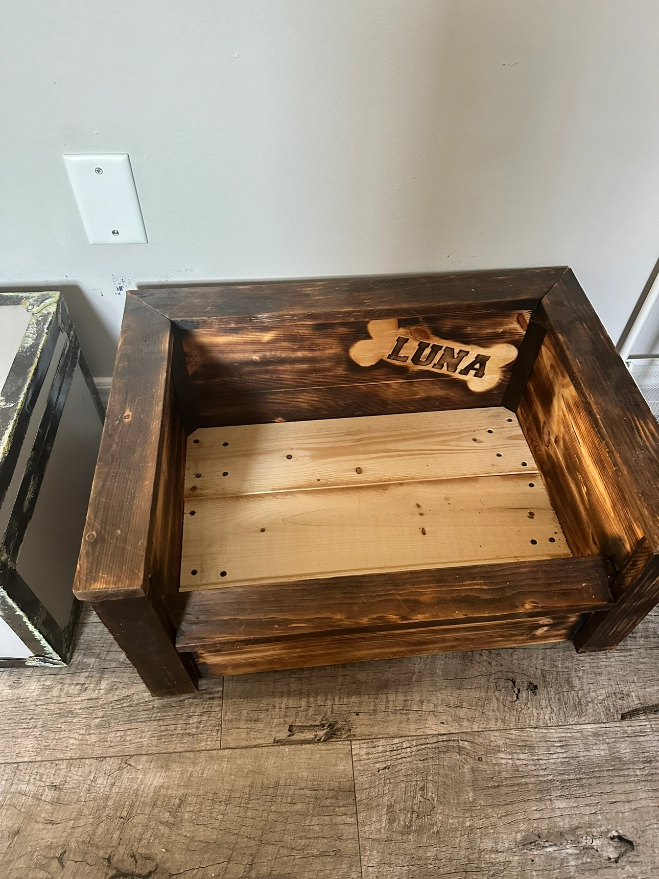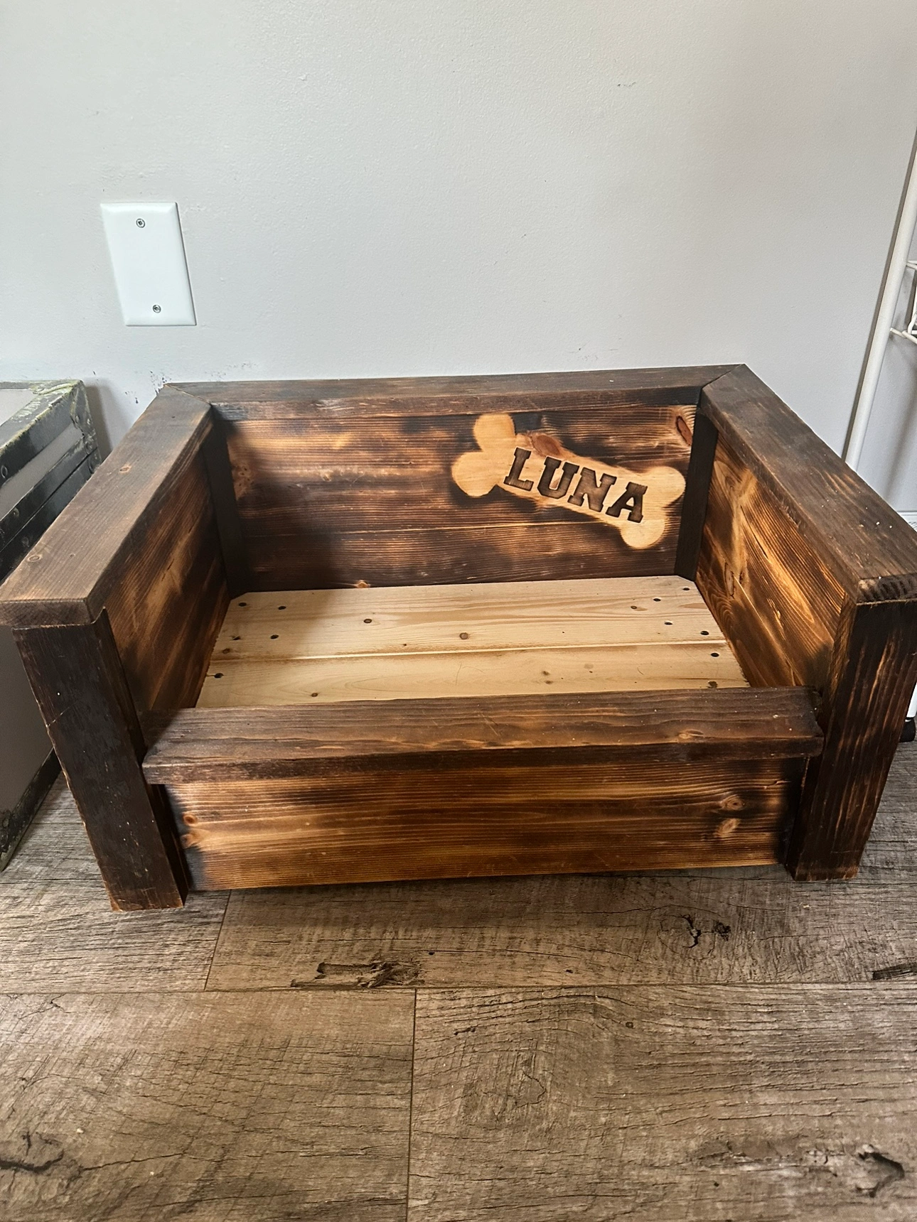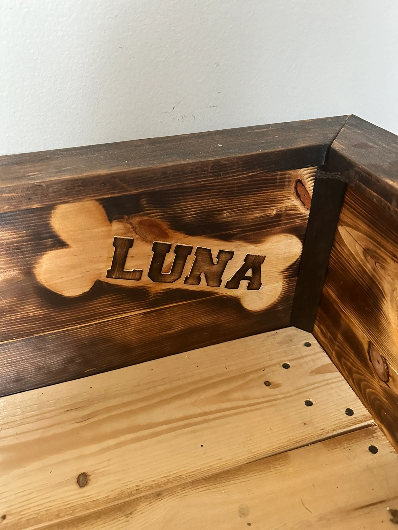 Personalized dog bed with a bone design and the name "Luna" burnt into the wood. The bed is made from wood and has a wooden frame. It has a raised edge for comfort. The bed is approximately 24" x 18" x 12".