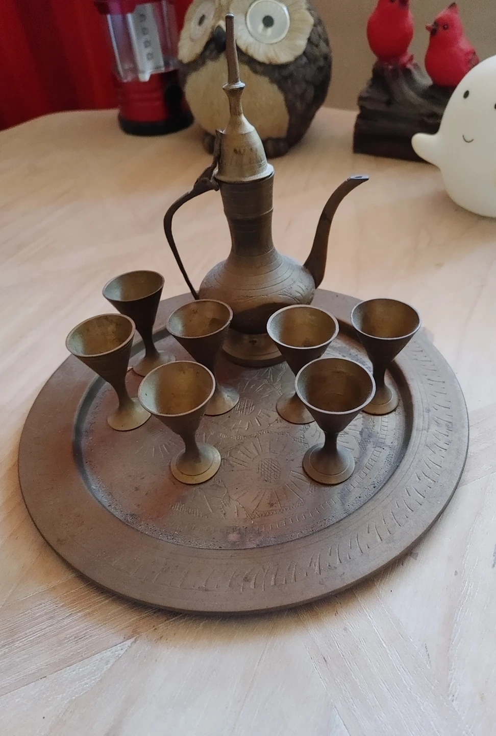This brass tea set is from India. I admit it needs cleaning but is otherwise undamaged. Approximately 50 years old.