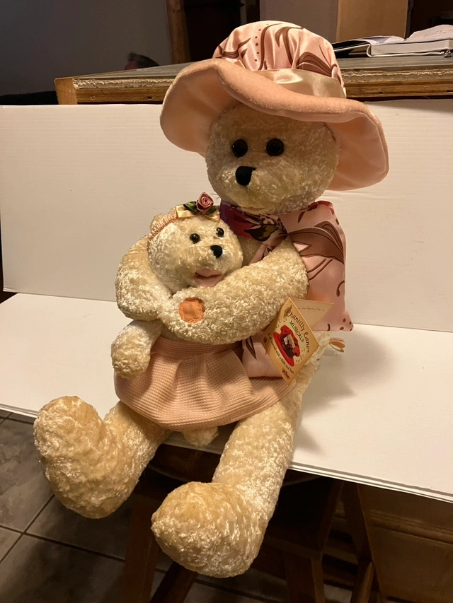 22Large plush bear holding a smaller plush bear. Both bears are wearing pink dresses and the larger bear has a pink hat. The tag states "Chantilly Lane Musicals".
