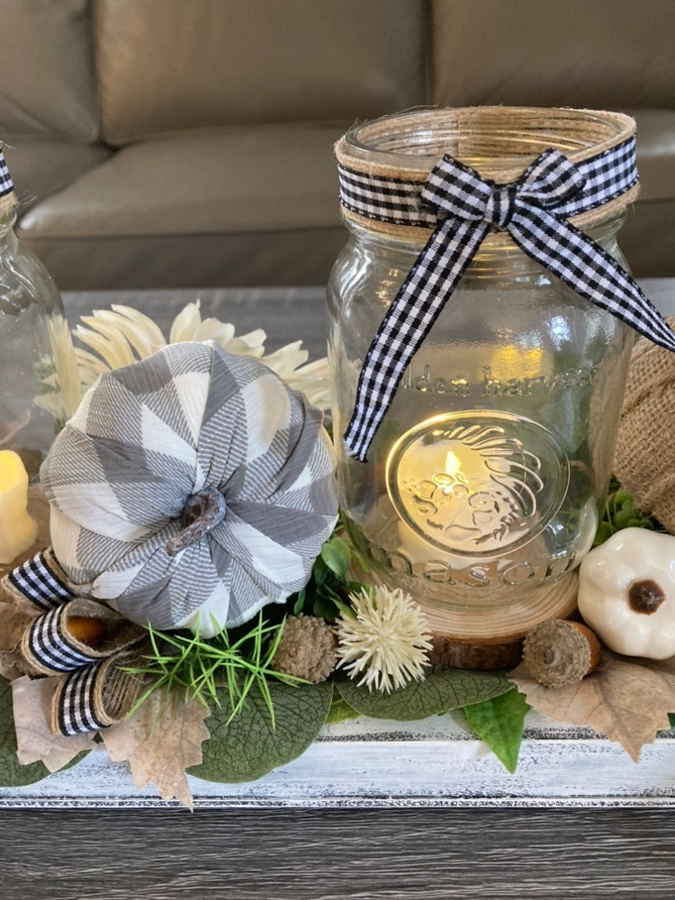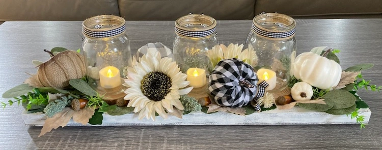 Fall table centrepiece with 3 small mason jars and battery operated tea light holders. No fire hazard. Approx. 6 3/4” tall 23” long by 6” deep Rustic white painted wood base holds artificial pumpkins, sunflowers, greenery, maple leaves, and acorns. Please follow the link below for more. Thanks. Facebook page: Artizanna https://www.facebook.com/profile.php?id=100073692274142 Or Instagram: @artizanna__