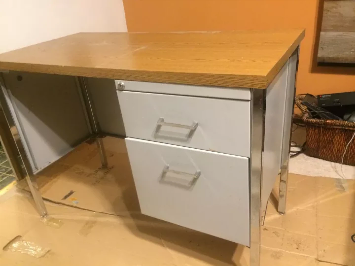 Selling a sturdy office desk with built-in drawers. It features a light wood-look top and white drawers with silver handles. Perfect for a home office or study space!